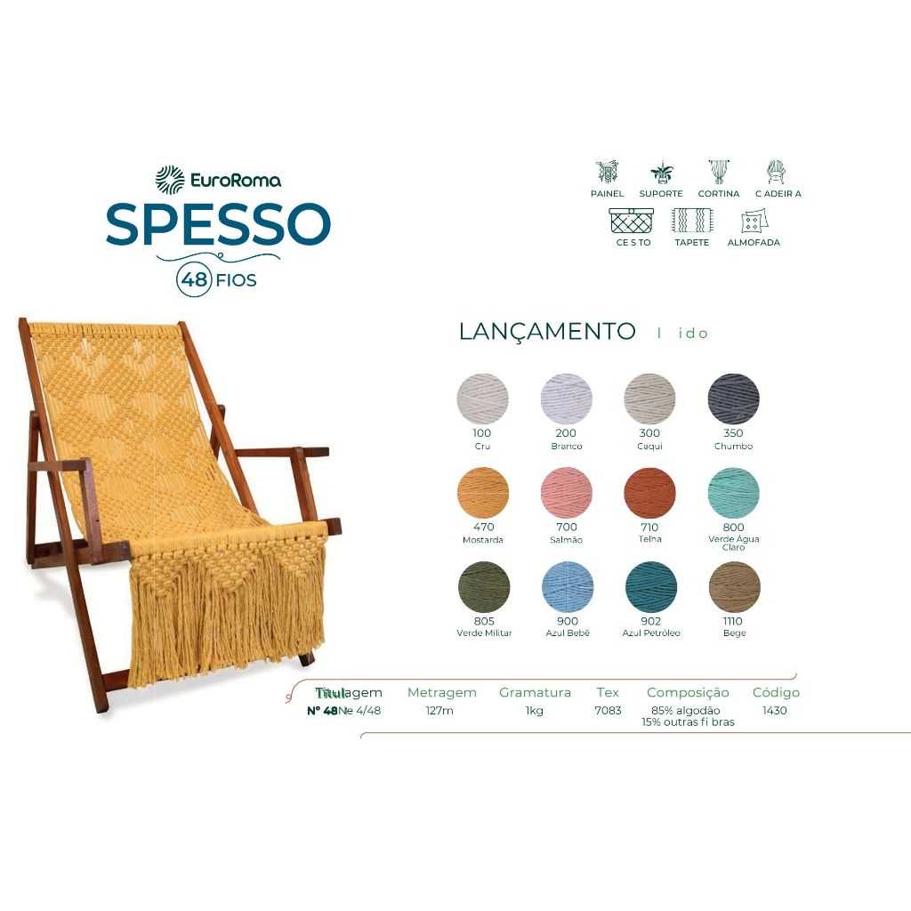 O barbante EuroRoma Spesso na sua versão de 48 fios oferece ao artesão a possibilidade de criar trabalhos manuais grandes, robustos e coloridos. Indicado principalmente para a técnica do macramê e projetos de design de interiores, este barbante é um grande aliado da criatividade. Especificações Composição: 85% algodão reciclado e 15% outras fibras Sugestão de agulhas: 12mm Metragem: 127m Titulagem: Nº 48 | NE 4/48 Peso: 1kg Tex: 7083