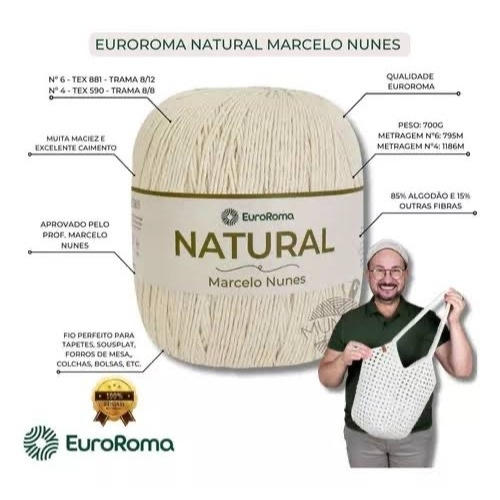 | Barbante EuroRoma Natural Marcelo Nunes 700g Fio Macio Número 4 e 6... | R$ 39,99 | 33% | 5.0/5 | — |