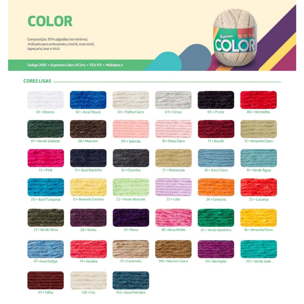 | Barbante Supremo Color 400 Gramas / 452 Metros este produto | R$ 23,99 | 44% | 4.9/5 | 103 |
