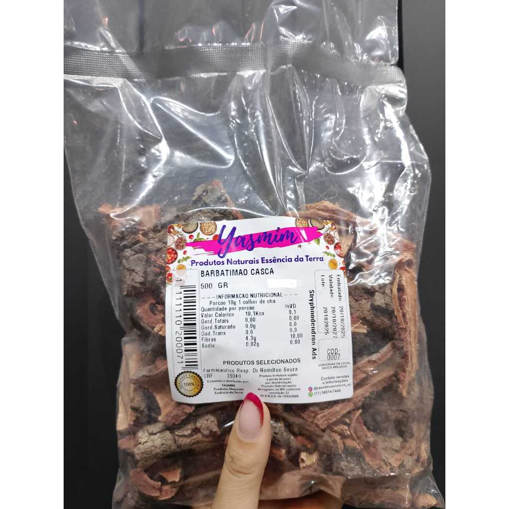 BARBATIMÃO CASCA ESPECIFICAÇÃO Produto: Barbatimão casca desidratada Estoque: Disponível DADOS BOTÂNICOS Nome Científico: Stryphnodendron adstringens Família: Fabaceae Parte Utilizada: Casca Nome Popular: Barbatimão Origem: Planta de ocorrência natural DESCRIÇÃO O barbatimão casca desidratada é um produto natural obtido a partir da casca da planta, submetida a processo adequado de secagem para preservação de suas características naturais. Apresenta fragmentos irregulares de casca, com coloração marrom-avermelhada a acastanhada e aroma vegetal característico. Produto tradicionalmente utilizado no preparo de chás e infusões. INGREDIENTES Barbatimão Stryphnodendron adstringens casca desidratada ALÉRGICOS Pode conter traços de outras ervas devido ao manuseio e processamento compartilhado. INFORMAÇÕES ADICIONAIS Produto natural sujeito a variação de cor, aroma e tamanho dos fragmentos conforme o lote. Armazenar em local seco, fresco e ao abrigo da luz. Embalagem meramente ilustrativa.