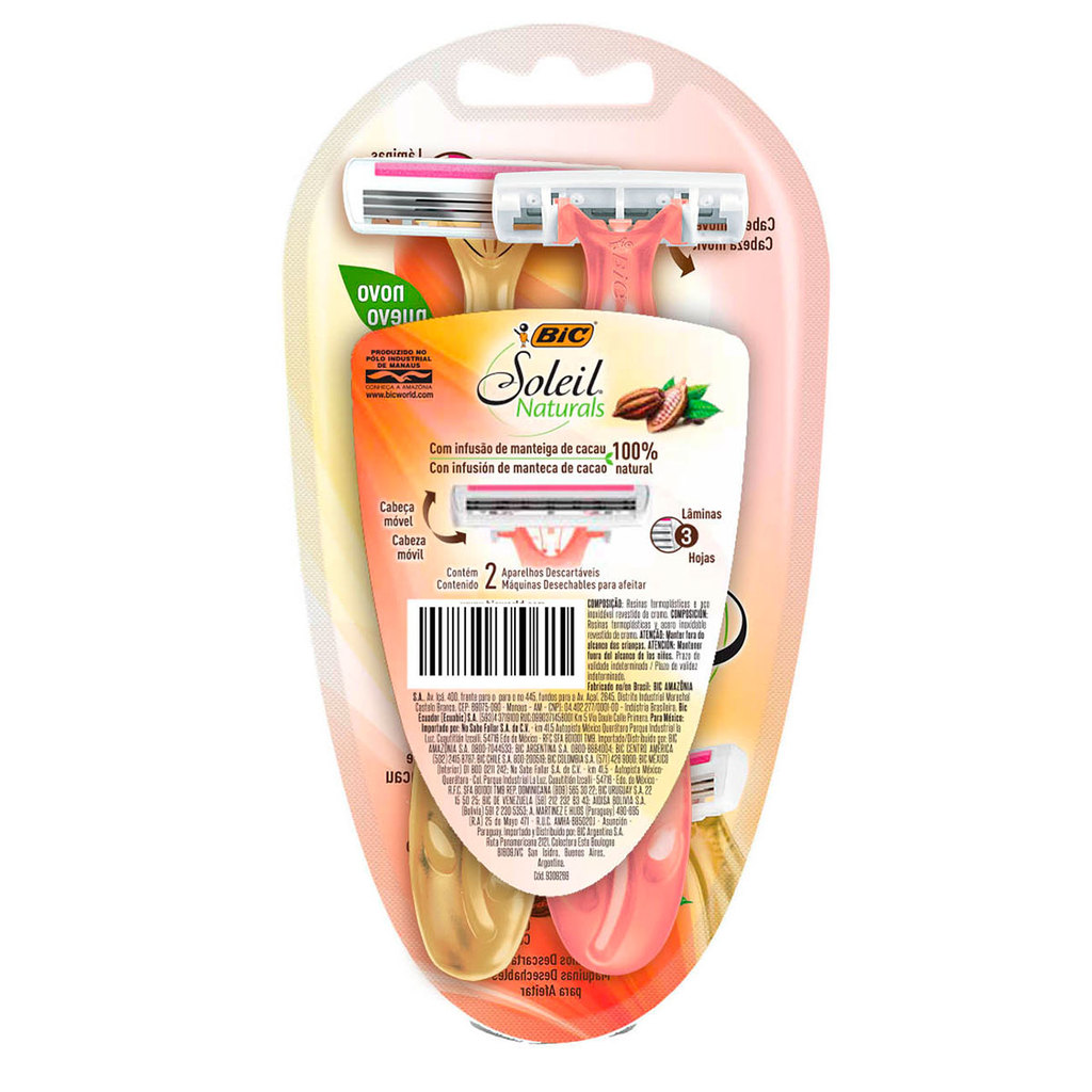 O Depilador BIC Soleil Naturals foi desenvolvido visando proporcionar uma depilação rente e suave. Suas 3 lâminas promovem um excelente desempenho. Sua cabeça móvel desliza facilmente pelos contornos da mulher. Sua dupla fita lubrificante conta com Manteiga de Cacau, além de contar com cabo ergonômico decorado, desenvolvido especialmente para as mulheres. Acredite na sua própria beleza com os Depiladores BIC Soleil Naturals. Aproveite! Detalhes: - 2 unidades nas cores laranja e amarelo; - 3 lâminas em cada cartucho com cabeça móvel; - Cabo ergonômico decorado; - Dupla fita lubrificante com Manteiga de Cacau;