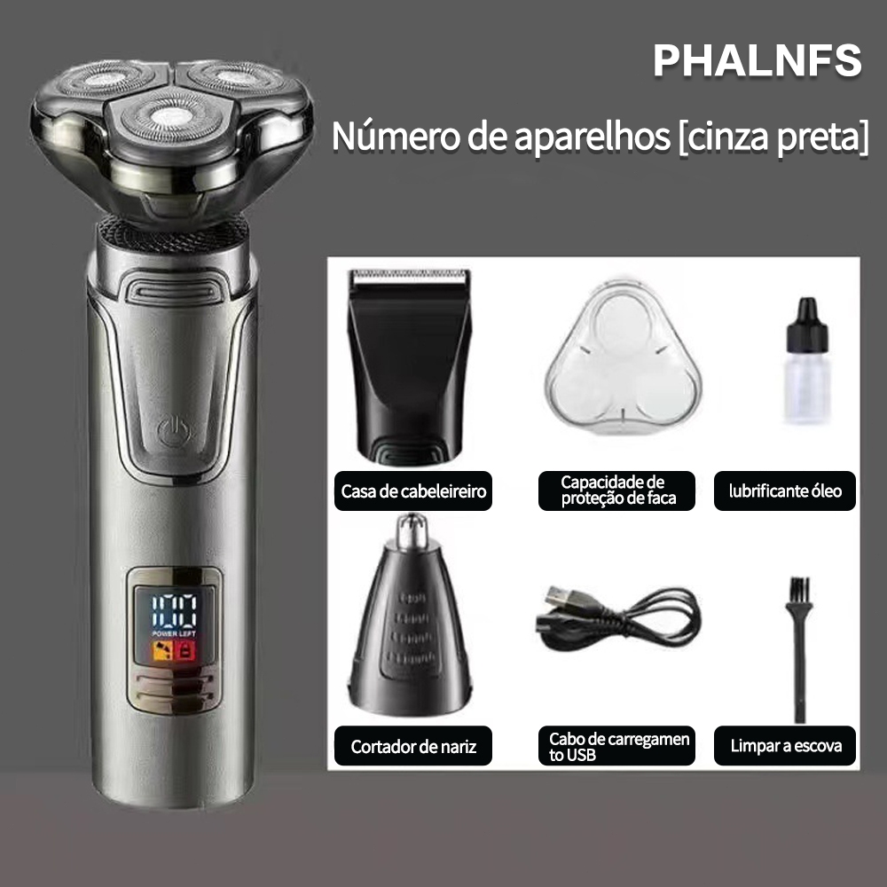 Tudo-em-Um Completo: Aparelho 3-em-1 com cabeças flutuantes intercambiáveis para barba, recorte de cabelo e corte de pelos do nariz. Tenha o conjunto completo de cuidados pessoais em um único dispositivo versátil. Potência Profissional & Visão Clara: Motor com 2 velocidades ajustáveis, atingindo incríveis 13.000 RPM para um desempenho mais forte e eficiente. Display digital LED integrado mantém você no controle do status e configurações. Precisão Máxima e Conforto: Malha dupla curvada garante um deslize suave de 360 graus, acompanhando perfeitamente os contornos do rosto para um barbeado mais rente, sem falhas e sem irritar a pele. Conectores reforçados nas cabeças previnem quebras. Resistente e Prático para Viagem: Classificação IP67 (à prova d'água e poeira) para fácil limpeza sob a torneira e uso seguro no chuveiro. Bateria de longa duração com recarga via USB 5V (cabo incluso), perfeito para levar em qualquer viagem. Presente Premium: Design moderno e alto desempenho fazem deste barbeador uma excelente escolha tanto para uso pessoal em casa quanto como presente de qualidade. Presentear com uma marca reconhecida demonstra cuidado e é muito bem recebido por familiares e amigos.