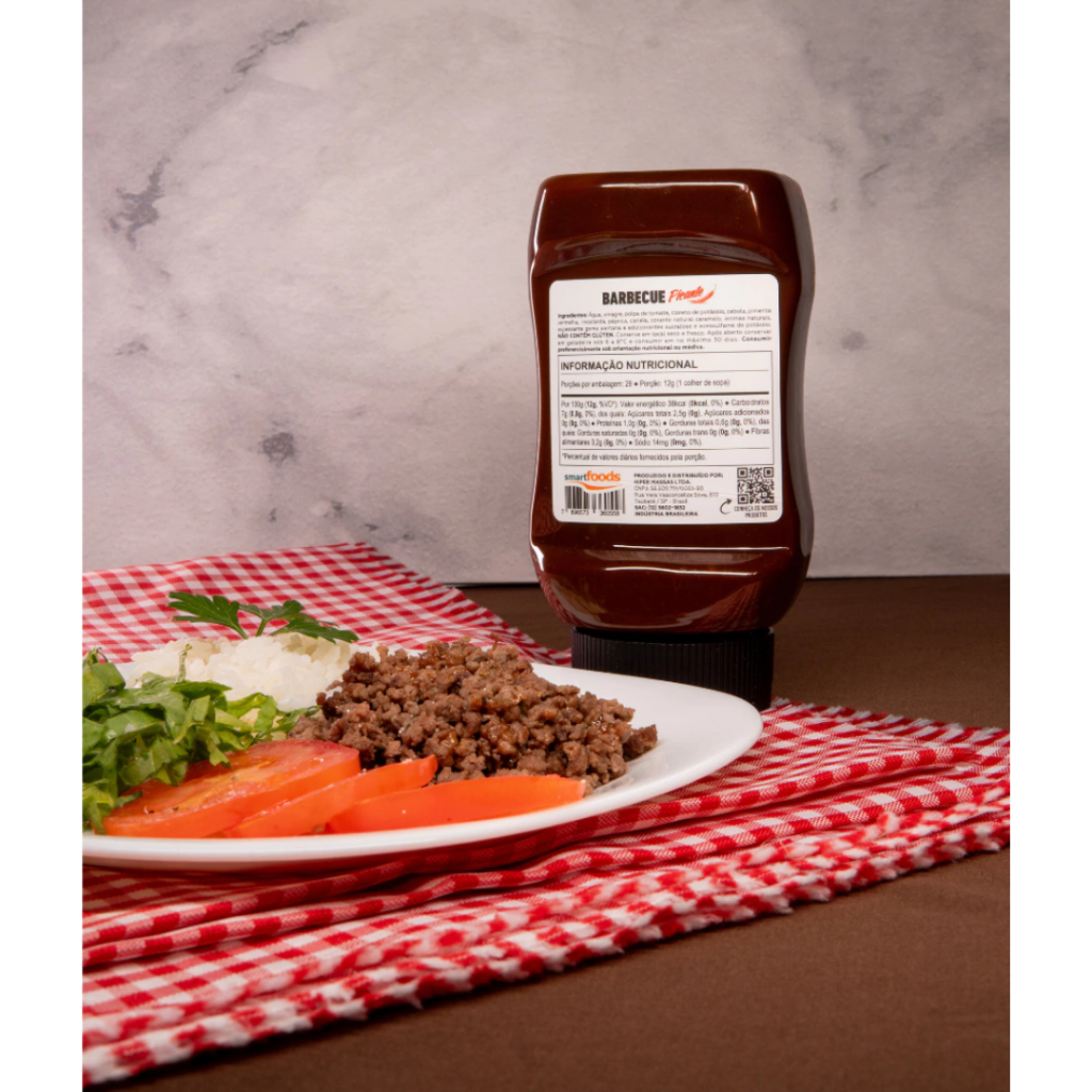 Barbecue Picante – Mrs Taste Benefícios: Sem Glúten, Sem Óleo de Palma, Vegano, Zero Açúcar, Zero Gordura, Zero Lactose, Baixo em Calorias, Muito baixo em Sódio e Sem adição de açúcares. O molho que você já conhece, com os benefícios que já conhece, agora na versão picante! Feito especialmente para os que apreciam pimenta sem se preocupar com suas calorias. Ingredientes: Água, vinagre, polpa de tomate, cloreto de potássio, cebola, pimenta vermelha, mostarda, páprica, canela, corante natural caramelo, aromas naturais, espessante goma xantana e edulcorantes sucralose e acessulfame de potássio. NÃO CONTÉM GLÚTEN.