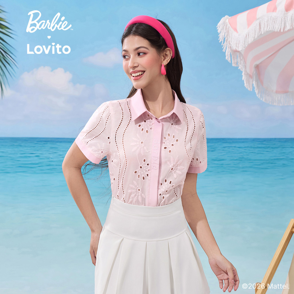 Barbie™ X Lovito Blusa Casual Bordada com Botão Primavera/verão Blusa Rosa para Mulheres LB1AD031