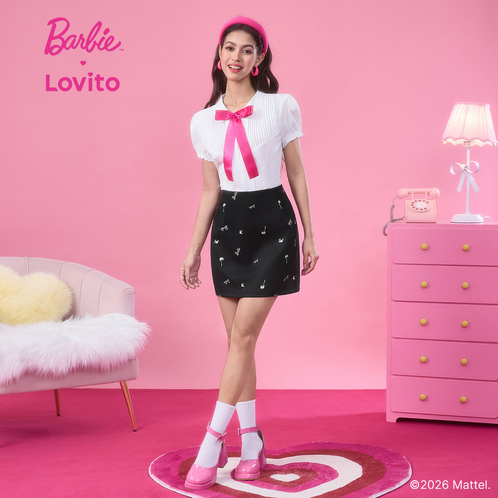Barbie™ X Lovito Saias Casuais Primavera/verão Saias Pretas para mulheres LB1AD048