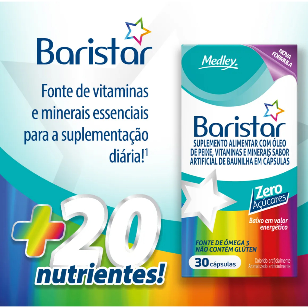 Baristar é um suplemento alimentar completo em cápsulas gelatinosas moles, formulado com 23 vitaminas e minerais essenciais para o bom funcionamento do organismo. Ideal para complementar a ingestão diária de nutrientes, especialmente em dietas desequilibradas ou em momentos de maior necessidade nutricional. Destaques: Contém 30 cápsulas por embalagem Rico em vitaminas do complexo B, C, D, E, A e minerais como zinco, ferro, magnésio e cálcio Sabor baunilha suave Zero açúcar Sem glúten Marca confiável: Medley (Grupo Sanofi) Composição (por porção de 2 cápsulas): Vitaminas: A, C, D3, E, K, B1, B2, B3, B6, B12, Ácido Fólico, Biotina, Ácido Pantotênico Minerais: Cálcio, Ferro, Zinco, Magnésio, Iodo, Selênio, Manganês, Molibdênio, Cobre, Cromo Indicação de Uso: Ingerir 1 a 2 cápsulas ao dia, ou conforme orientação médica ou de nutricionista. Conservação: Manter em local seco, fresco, longe da luz solar e fora do alcance de crianças. EAN: 7896422544894 Registro MS: Produto regularizado conforme normas da Anvisa.
