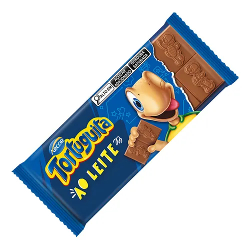 Chocolate ao Leite Tortuguita, da marca Arcor, em barra com 80 gramas. Levando ao paladar a doçura e a cremosidade que são características do chocolate ao leite, o tablete conta com desenhos especiais de tartarugas, que são o símbolo da linha. Combinando com diferentes momentos, é a opção perfeita para quem busca um doce prático para consumir ao longo do dia. Feito com ingredientes selecionados, seu preparo inclui açúcar, manteiga de cacau, leite integral em pó, massa de cacau, soro de leite em pó, permeado de soro de leite em pó, gordura vegetal, sal e outros itens. Ideal para ser consumido puro, o chocolate também pode ser acompanhado de sorvetes, cremes, mousses e outros, podendo inclusive ser usado como ingrediente em receitas. Sua porção de 25 gramas (3 quadradinhos) possui valor energético de 133 kcal, 15 gramas de carboidratos, 1,3 grama de proteínas, 7,5 gramas de gorduras totais e 33 miligramas de sódio. Para manter a qualidade do chocolate, recomenda-se armazená-lo em local seco e fresco, ao abrigo do calor excessivo. Após aberto, deve ser mantido sob refrigeração, seguindo as indicações da embalagem. ALÉRGICOS: Contém glúten, lactose e derivados de leite e de soja. Pode conter trigo, cevada, aveia, centeio, amendoim, amêndoas, avelãs, nozes, castanha-de-caju, castanha-do-Pará, coco e látex natural.