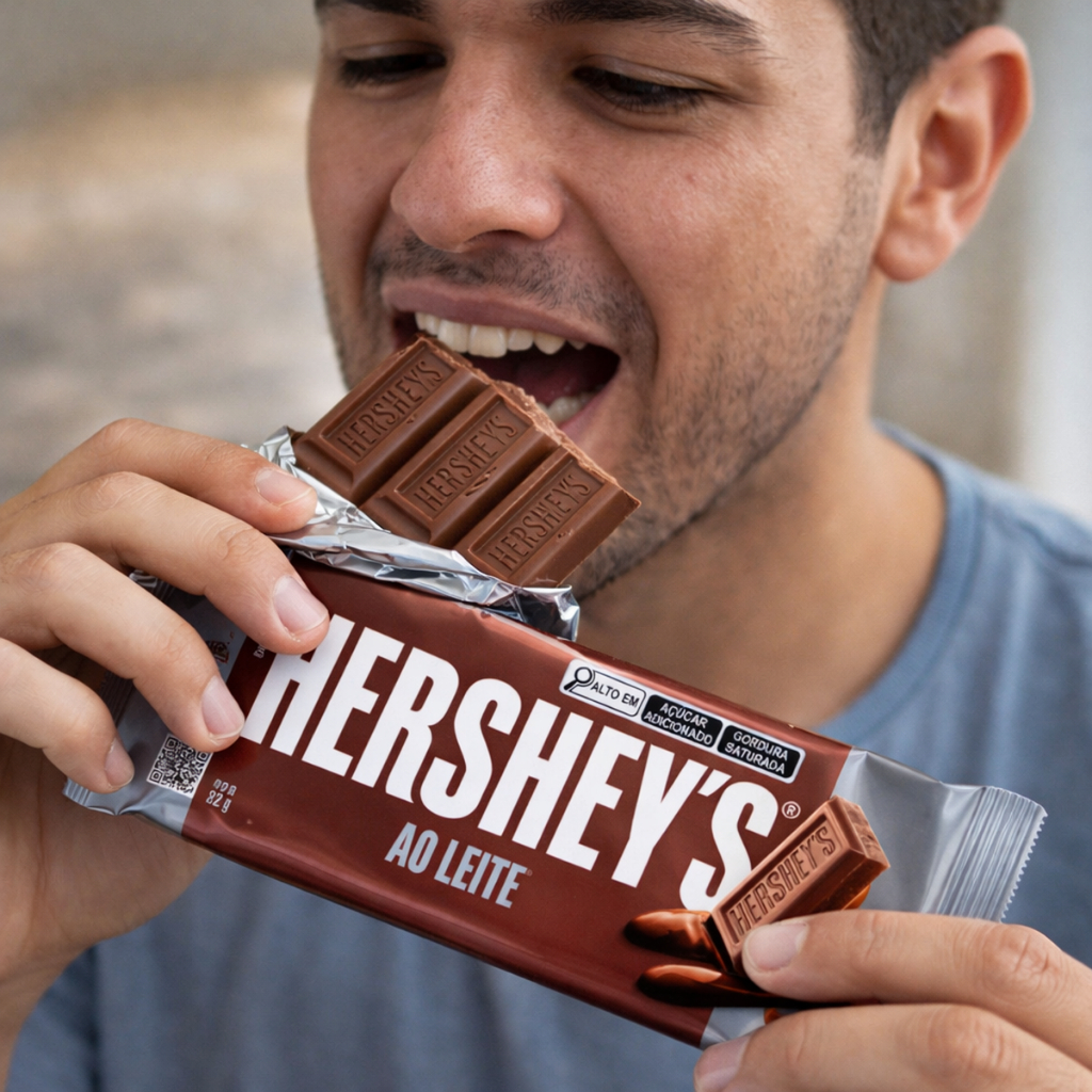 A vida é muito melhor com chocolate! Delicioso chocolate ao leite Hersheys. A Hershey's é uma marca centenária americana, fundada em 1898 por Milton Hershey visando popularizar o chocolate. Conhecida mundialmente por suas barras de chocolate ao leite, a marca oferece uma grande variedade de sabores e formatos. Chocolate ao Leite Peso Líquido 82g. Ingredientes: Açúcar, massa de cacau, manteiga de cacau, leite integral em pó, permeado de soro de leite em pó, gordura vegetal, gordura anidra de leite, soro de leite em pó, emulsificantes lecitina de soja e poliglicerol polirricinoleato e aromatizante. Contém glúten. Contém lactose. Alérgicos: contém derivados de soja, leite e derivados. Pode conter trigo, amendoim, amêndoa, avelãs, castanha-de-caju, castanha-do-pará, nozes e látex natural. Extra Cremoso Ingredientes: Açúcar, manteiga de cacau, leite integral em pó, massa de cacau, permeado de soro de leite em pó, gordura vegetal, leite desnatado em pó, gordura anidra de leite, soro de leite em pó, emulsificantes lecitina de soja e poliglicerol polirricinoleato e aromatizantes. Contém glúten. Contém Lactose. Alérgicos: Contém derivados de soja, leite e derivados. Pode conter trigo, amendoim, amêndoa, avelãs, castanha-de-caju, castanha-do-pará, nozes e látex natural. Chocolate Branco Ingredientes: Açúcar, manteiga de cacau, leite integral em pó, permeado de soro de leite em pó, gordura vegetal, leite desnatado em pó, soro de leite em pó, emulsificantes lecitina de soja e poliglicerol polirricinoleato e aromatizante. Cookies 'n' Creme Ingredientes: Açúcar, manteiga de cacau, biscoito sabor chocolate, leite integral em pó, permeado de soro de leite em pó, gordura vegetal, leite desnatado em pó, soro de leite em pó, emulsificantes lecitina de soja e poliglicerol polirricinoleato e aromatizantes. Amendoim Ingredientes: Açúcar, amendoim, massa de cacau, leite integral em pó, manteiga de cacau, gordura vegetal, permeado de soro de leite em pó, gordura anidra de leite, soro de leite em pó, emulsificantes lecitina de soja e poliglicerol poliricinoleato e aromatizante. CONTÉM GLÚTEN. CONTÉM LACTOSE. ALÉRGICOS: CONTÉM AMENDOIM, DERIVADOS DE SOJA, LEITE E DERIVADOS. PODE CONTER TRIGO, AMÊNDOA, AVELÃS, CASTANHA-DE-CAJU, CASTANHA-DO-PARÁ, NOZES E LÁTEX NATURAL. Ovomaltine Ingredientes: Açúcar, massa de cacau, leite integral em pó, manteiga de cacau, Ovomaltine® (açúcar, extrato de cereal (cevada e malte), glucose, cacau em pó, fosfato tricálcico, sal, canela, emulsificante lecitina de soja, regulador de acidez carbonato de sódio e aromatizante), permeado de soro de leite em pó, gordura vegetal, gordura anidra de leite, soro de leite em pó, emulsificantes: lecitina de soja e poliglicerol polirricinoleato e aromatizante. CONTÉM GLUTÉN. CONTÉM LACTOSE. ALÉRGICOS: CONTÉM DERIVADOS DE SOJA, CEVADA E DERIVADOS E LEITE E DERIVADOS. PODE CONTER TRIGO, CENTEIO, AVEIA, AMENDOIM, AMÊNDOA, AVELÃS, CASTANHA-DE-CAJU, CASTANHA-DO-PARÁ, MACADÂMIAS, NOZES E LÁTEX NATURAL. Somos uma loja especializada em artigos de festa, confeitaria, embalagens e atacados em doces com lojas físicas no estado de São Paulo, desde 2002.