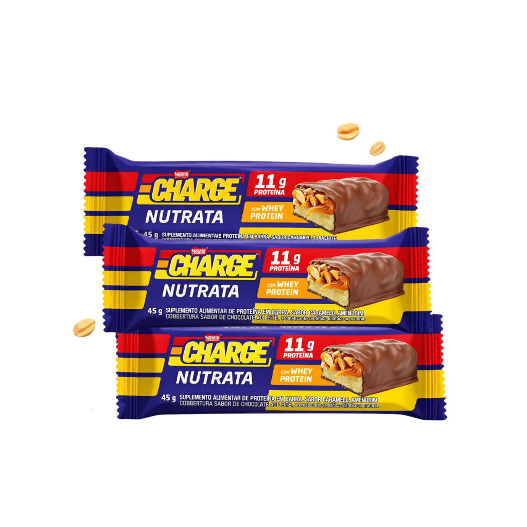 A Nutrata e a Nestlé se unem em uma collab que nasce da busca constante por inovação e qualidade. O Charge Nutrata reúne chocolate ao leite, caramelo e amendoim com proteínas de alta qualidade. Disponível na versão de 45g, oferece 11g de proteína provenientes do whey protein, sem adição de açúcares e zero glúten, o produto foi desenvolvido para preservar sabor e textura característicos do Charge®, ao mesmo tempo em que atende às necessidades de consumidores que buscam uma fonte funcional de proteínas para o consumo diário. ------------------------------------------------------------------------------------------ Posso consumir em meu processo de emagrecimento? ------------------------------------------------------------------------------------------ Sim, pode! As barras de proteína são uma excelente opção para os dias mais corridos, em que precisamos de algo prático, mas ainda nutritivo e proteico. -------------------------- Contém glúten? -------------------------- Celíacos e intolerantes podem consumir a barra Charge Nutrata, pois ela não contém glúten na composição e não há risco de contaminação cruzada durante o processo de fabricação. --------------------- Ingredientes: --------------------- Recheio sabor caramelo (maltitol, polidextrose, gordura vegetal, leite em pó desnatado, cacau em pó, aromatizantes, emulsificante lecitina de soja, espessante pectina, edulcorante glicosídeos de esteviol de Stevia rebaudiana Bertoni e corante extrato de urucum, base norbixina), cobertura sabor chocolate ao leite (gordura vegetal, soro de leite em po, cacau em pó, edulcorante maltitol, emulsificante lecitina de soja, conservante sorbato de potássio e aromatizante), amendoim torrado, colageno hidrolisado, proteína de soro do leite concentrada, caseinato de cálcio, proteína concentrada de leite obtida de leite bovino, pasta de amendoim, gordura de palma, frutooligossacarídeos (FOS), proteína de soro do leite isolada, polidextrose, edulcorante xarope de maltitol, umectante glicerol, emulsificantes lecitina e goma acácia, aromatizantes, antiumectante fosfato tricálcico e antioxidante di-alfa-tocoferol. ALÉRGICOS: CONTÉM AMENDOIM E DERIVADOS DE LEITE E SOJA. PODE CONTER AMÊNDOA, AVELÁS, CASTANHA-DE-CAJU, CASTANHA-DO-BRASIL, NOZES, OVOS E PISTACHES. CONTEM LACTOSE. NÃO CONTÉM GLÚTEN.