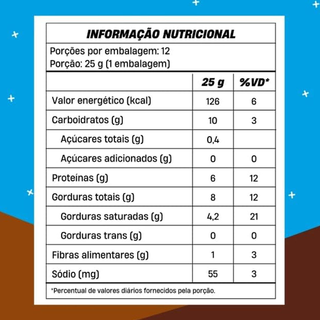 Quantidade: 12 pacotinhos (25 g cada)Proteína: 6 g por porção de 25 gAçúcar: zero adição de açúcarIngredientes: proteína concentrada do soro do leite, avelã, cacau, wafer, edulcorantes (maltitol e sucralose), entre outrosAlérgenos: contém glúten, lactose, soja, derivados do leite; pode conter amendoim e castanhas