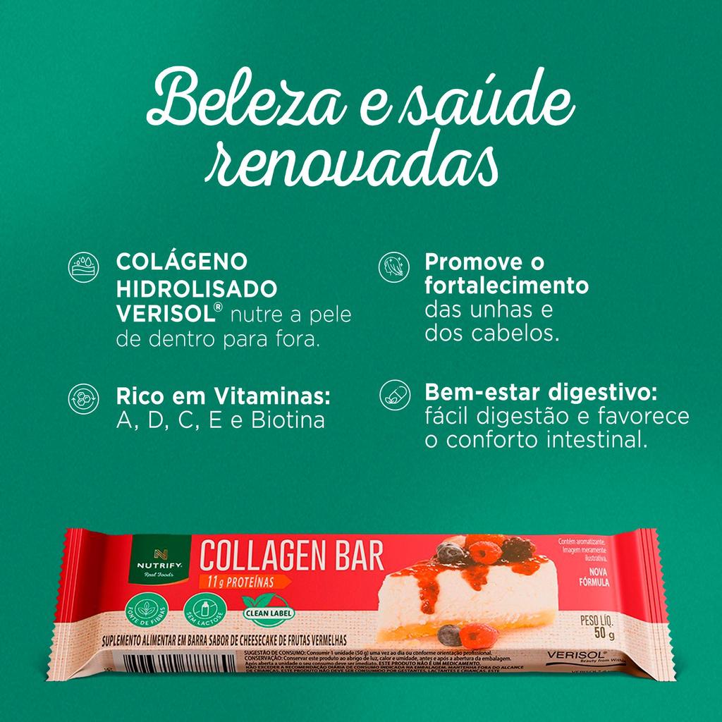 A Collagen Bar Nutrify é uma barra proteica pensada para rotina — prática, saborosa e com especificações claras. Cada unidade (50 g) entrega 11 g de proteína e é fonte de fibras, oferecendo uma alternativa objetiva para quem quer uma opção portátil para o dia a dia, sem complicação e sem “promessas milagrosas”. A fórmula inclui 2,5 g de peptídeos bioativos de colágeno VERISOL® por unidade, além de biotina e um mix de vitaminas e minerais (A, D, E, C, cromo, selênio e zinco). O resultado é uma barra de textura macia, com proposta mais “indulgente”, disponível em 5 sabores, e sem aditivos artificiais (conforme a formulação do fabricante). Este produto é um suplemento alimentar. Em caso de restrições alimentares, gestação, lactação, uso por crianças ou qualquer condição específica, confira a lista de ingredientes e, se necessário, busque orientação de um profissional de saúde.