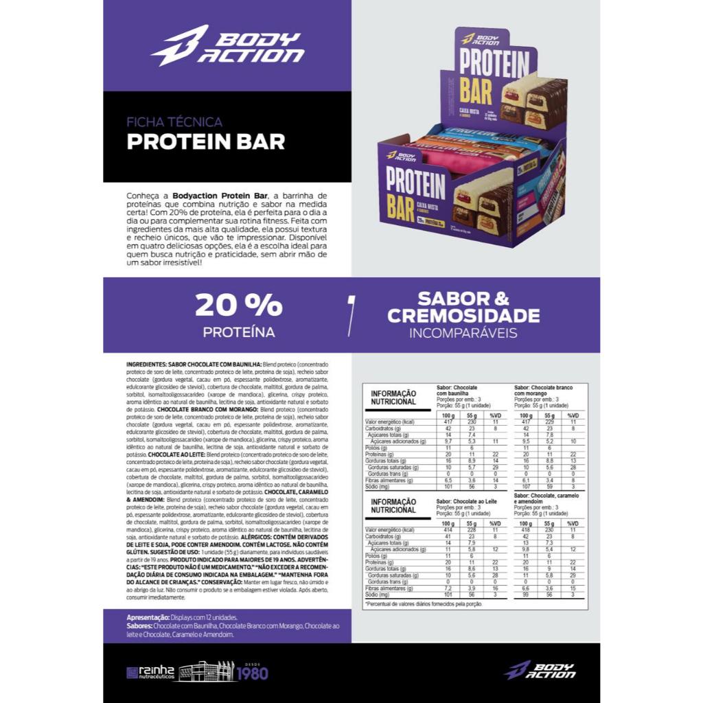 PROTEIN BAR Conheça a Bodyaction Protein Bar, a barrinha de proteínas que combina nutrição e sabor na medida certa! Com 20% de proteína, ela é perfeita para o dia a dia ou para complementar sua rotina fitness. Feita com ingredientes da mais alta qualidade, ela possui textura e recheio únicos, que vão te impressionar. Disponível em quatro deliciosas opções, ela é a escolha ideal para quem busca nutrição e praticidade, sem abrir mão de um sabor irresistível! INGREDIENTES: SABOR CHOCOLATE COM BAUNILHA: Blend proteico (concentrado proteico de soro de leite, concentrado proteico de leite, proteina de soja), recheio sabor chocolate (gordura vegetal, cacau em pó, espessante polidestrose, aromatizante. edulcorante glicosídeo de steviol), cobertura de chocolate, maltitol, gordura de palma. sorbitol, isomaltooligossacardeo (xarope de mandioca), glicerina, crispy proteico. aroma idêntico ao natural de baunilha, lecitina de soja, antioxidante natural e sorbato de potássio. CHOCOLATE BRANCO COM MORANGO: Blend proteico (concentrado proteico de soro de leite, concentrado proteico de leite, proteina de soja), recheio sabor chocolate (gordura vegetal, cacau em pó, espessante polidextrose, aromatizante. edulcorante glicosídeo de steviol), cobertura de chocolate, maltitol, gordura de palma. sorbitol, isomaltooligossacarideo (xarope de mandioca), glicerina, crispy proteico, aroma idêntico ao natural de baunilha, lecitina de soja, antioxidante natural e sorbato de potássio. CHOCOLATE AO LEITE: Blend proteico (concentrado proteico de soro de leite, concentrado proteico de leite, proteína de soja), recheio sabor chocolate (gordura vegetal, cacau em po, espessante polidextrose, aromatizante, edulcorante glicosideo de steviol). cobertura de chocolate, maltitol, gordura de palma, sorbitol, Isomaltooligossacarideo (xarope de mandioca), glicerina, crispy proteico, aroma idêntico ao natural de baunilha, lecitina de soja, antioxidante natural e sorbato de potássio. CHOCOLATE, CARAMELO & AMENDOIM: Blend proteico (concentrado proteico de soro de leite, concentrado proteico de leite, proteína de soja), recheio sabor chocolate (gordura vegetal, cacau em po, espessante polidextrose, aromatizante, edulcorante glicosideo de steviol). cobertura de chocolate, maltitol, gordura de palma, sorbitol, isomaltooligossacarideo (xarope de mandioca), glicerina, crispy proteico, aroma idêntico ao natural de baunilha, lecitina de soja, antioxidante natural e sorbato de potássio. ALÉRGICOS: CONTÉM DERIVADOS DE LEITE E SOJA, PODE CONTER AMENDOIM. CONTÉM LACTOSE. NÃO CONTÉM GLÚTEN. SUGESTÃO DE USO: 1 unidade (55 g) diariamente, para indivíduos saudáveis a partir de 19 anos. PRODUTO INDICADO PARA MAIORES DE 19 ANOS. ADVERTÊNCIAS: "ESTE PRODUTO NÃO É UM MEDICAMENTO." "NÃO EXCEDER A RECOMENDAÇÃO DIÁRIA DE CONSUMO INDICADA NA EMBALAGEM.* "MANTENHA FORA DO ALCANCE DE CRIANÇAS." CONSERVAÇÃO: Manter em lugar fresca, não úmido e ao abrigo da luz. Não consumir o produto se a embalagem estiver violada. Após aberto consumir imediatamente.