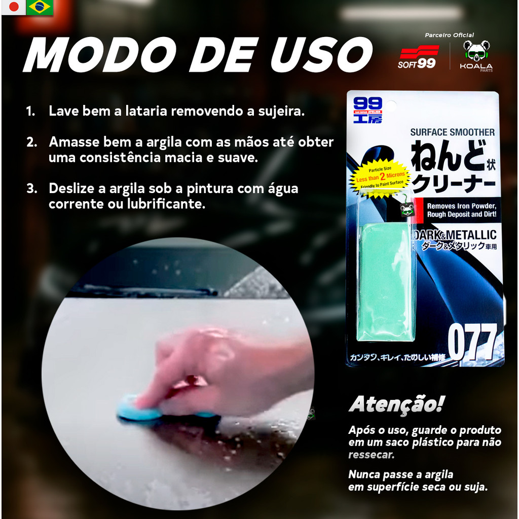 Clay Bar Dark & Metallic 150g – descontaminação segura para pinturas escuras A Clay Bar Dark & Metallic, da Soft99 — marca japonesa referência em inovação e qualidade no cuidado automotivo — foi desenvolvida para descontaminação profunda e segura, especialmente em pinturas escuras, onde riscos são mais visíveis. Com abrasividade média e partículas menores que 2 microns, ela remove fácil limalhas de ferro, resíduos de borracha, pulverização de tinta e outras impurezas que grudam na pintura. Limpa, descontamina e prepara a superfície do seu carro pra receber ceras, selantes ou cristalizadores, minimizando qualquer risco na aplicação. - Abrasividade média, segura para pinturas escuras - Remove limalhas de ferro, resíduos de borracha, pulverização de tinta e mais - Prepara a pintura para ceras, selantes ou cristalizadores - Menos riscos, mais proteção pra sua pintura Sua textura balanceada desliza suave, capturando e removendo contaminantes incrustados sem agredir a pintura, especialmente as mais delicadas e escuras. Isso evita riscos e imperfeições na aplicação de camadas de proteção, garantindo um acabamento mais liso e duradouro. Perfeita pra tirar pulverização de tinta, seiva, fezes de pássaros, insetos, poluição, pó de freio, pigmentos de asfalto e outras sujeiras. Modo de uso: 1. Lave bem a superfície da lataria 2. Amasse a barra com as mãos até obter uma consistência macia e uniforme 3. Deslize a barra sobre a pintura com água corrente ou lubrificante automotivo 4. Finalize a descontaminação com uma toalha de microfibra limpa e seca > Não utilize em superfície seca ou suja. Enviamos bem embalado, super rápido e com garantia de originalidade. Garanta o seu e confira os outros produtos da nossa Loja Koala Parts. Especificações Técnicas: Produto: Clay Bar Dark e Metallic Marca: Soft99 (Japão) Tipo: Barra descontaminante Composto: Resina sintética Finalidade: Descontaminação de superfícies Conteúdo: 150g Dimensões: 10 × 15 × 15 cm Abrasividade: Média Aplicação: Pinturas escuras Conteúdo da embalagem 01. Clay Bar Barra descontaminante 150g