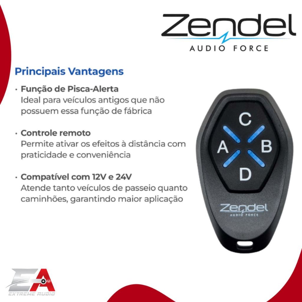 JOGO DE LUZES ZENDEL BARRA LIMPA BIVOLT 12V/24V COM CONTROLE Transforme o visual do seu veículo com efeitos de luz impressionantes. Características: - Compatível com 12V e 24V (BIVOLT) - Controle remoto incluso - Função pisca-alerta para veículos que não possuem de fábrica - 9 efeitos visuais diferentes, incluindo modos alternados e strobo - Personalização simples e rápida dos efeitos Modos incluídos: - 4 alternados: setas, faróis, milhas - 4 alternados: piscas - 1 modo strobo (faróis) Compatibilidade: - Indicado para carros, caminhões, ônibus e qualquer veículo com sistema elétrico 12V ou 24V. Atenção: Este produto não é à prova d’água. Se for instalado em local exposto à umidade, recomenda-se isolar as entradas dos fios e proteger a central com material impermeável. Conteúdo da embalagem: - 1 Central Barra Limpa Zendel Bivolt - 1 Controle remoto - 1 Cordão Zendel - 1 Manual de instalação Garantia de fábrica: 3 meses