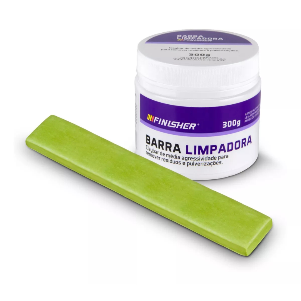 Barra Limpadora Clay Bar Finisher 300g A Barra Limpadora " Clay Bar " foi desenvolvida para remover pulverizações de tinta e resíduos sobre a pintura, vidros e partes cromadas de automóveis. Clay Bar de média agressividade, com base em borracha sintética. Segura para aplicar em todos os tipos de verniz, efetiva em 95% dos casos de contaminações. - Não mancha plásticos ou borrachas. - Não agride o verniz. - Não deixa resíduos em frestas. Instruções de Uso: Antes de iniciar a aplicação deste produto, certifique que a área aplicada está limpa, fria e sobre proteção solar. Identifique as áreas contaminadas que apresentam aspereza ao tato. Utilize água como lubrificante ou a Cera Líquida para um melhor resultado e passe a Barra exercendo leve pressão. Observe que a superfície logo ficará lisa e polida. Em seguida use uma flanela de microfibra em conjunto com a Cera Líquida para dar o lustre final. Vá esticando e dobrando a massa para limpar, a medida que ela fique muito suja. Pode ser aplicado sobre os vidros e lanternas. Após o uso, guarde em um local protegido de contaminantes externos, mas não fechado, para que não fique molhada e estrague com o tempo. Dicas: Para saber se a superfície está contaminada ou não, vista a sua mão com uma sacola plástica e passe na pintura, após o carro estar lavado. Assim fica muito mais claro sentir a contaminação. Pode ser usada em vidros para ajudar a renovar a aparência Quando for reutilizar a massa ela estará com uma consistência diferente da original, estique e dobre até voltar a consistência. Prefira utilizar em conjunto com o lubrificante de Clay Bar Finisher, o resultado final será excelente.
