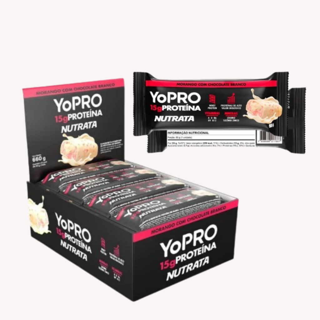 A barra de proteína Nutrata YoPRO unifica a expertise de duas grandes marcas em nutrição e sabor. Dessa parceria que une a credibilidade da Nutrata no desenvolvimento de snacks proteicos e a experiência da Danone no segmento, o mercado nacional recebe mais uma opção inovadora: UMA BARRA DE PROTEÍNA DELICIOSA, NUTRITIVA E PRÁTICA. ----------------------------------------------- Benefícios da Nutrata YoPRO ----------------------------------------------- - 15g de proteína; - Vitaminas A, D, B6, B9, B12; - Minerais Cromo, Selênio e Zinco; - Blend de proteína de alto valor biológico; ----------------------------------------------- Sugestão e Indicação de Uso ----------------------------------------------- Consumir uma unidade ao dia. ----------------------------------------------- Ingredientes: ----------------------------------------------- Sabor Chocolate: Blend proteico (caseinato de cálcio, proteína concentrada de leite, proteína de soro do leite concentrada, proteína de soro do leite isolada e colágeno hidrolisado), cobertura de chocolate meio amargo, recheio cremoso sabor chocolate, óleo de palma (Elaeis guineenses), cacau em pó, polidextrose, crispies sabor chocolate, iogurte natural integral em pó, vitaminas (acetato de retinol, colecalciferol, cloridrato de piridoxina, ácido fólico e cianocobalamina), minerais (sulfato de zinco, selenito de sódio e picolinato de cromo), aromatizantes, cloreto de sódio, edulcorantes sorbitol e sucralose, umectante glicerol, antiumectante fosfato tricálcico, emulsificantes goma acácia e lecitina de girassol, conservantes sorbato de potássio e benzoato de sódio e antioxidante DI-alfa-tocoferol. CONTÉM LACTOSE. ALÉRGICOS: CONTÉM DERIVADOS DE LEITE E SOJA. PODE CONTER AMENDOIM E AVELÃ. NÃO CONTÉM GLÚTEN. Sabor Morango com Chocolate Branco: Blend proteico (caseinato de cálcio, proteína concentrada de leite, proteína de soro do leite concentrada, proteína de soro do leite isolada e colágeno hidrolisado), cobertura de chocolate branco, recheio cremoso sabor chocolate branco, óleo de palma (Elaeis guineenses), iogurte natural integral em pó, polidextrose, crispies sabor morango, vitaminas (acetato de retinol, colecalciferol, cloridrato de piridoxina, ácido fólico e cianocobalamina), minerais (sulfato de zinco, selenito de sódio e picolinato de cromo), aromatizantes, cloreto de sódio, edulcorantes sorbitol e sucralose, umectante glicerol, antiumectante fosfato tricálcico, emulsificantes goma acácia e lecitina de girassol, conservantes sorbato de potássio e benzoato de sódio, antioxidante DI-alfa-tocoferol e corantes vermelho allura Ac e carmins. CONTÉM LACTOSE. ALÉRGICOS: CONTÉM DERIVADOS DE LEITE E SOJA. PODE CONTER AMENDOIM E AVELÃ. NÃO CONTÉM GLÚTEN.