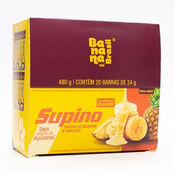 Supino Zero - 20 Unidades 24g Banana e Abacaxi - Banana Brasil Nossa receita pioneira é produzida com recheio de banana e abacaxi desidratado e cobertura de chocolate branco sem adição de açúcares. INGREDIENTES: Banana-passa, cobertura de chocolate branco sem adição de açúcares, abacaxi desidratado, gordura de palma, acidulante ácido cítrico e aromatizante natural. ALÉRGICOS: CONTÉM LEITE E DERIVADOS. PODE CONTER AMÊNDOA, AMENDOIM, AVELÃS, CASTANHA-DO-BRASIL, CASTANHA-DE-CAJU, MACADÂMIAS, NOZES, PECÃS, PISTACHES E SOJA.CONTÉM LACTOSE. NÃO CONTÉM GLÚTEN. Barra de frutas recheio de banana e açaí desidratados e cobertura de chocolate ao leite sem adição de açúcares.