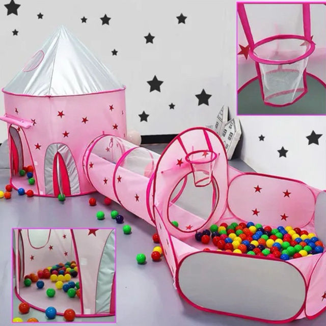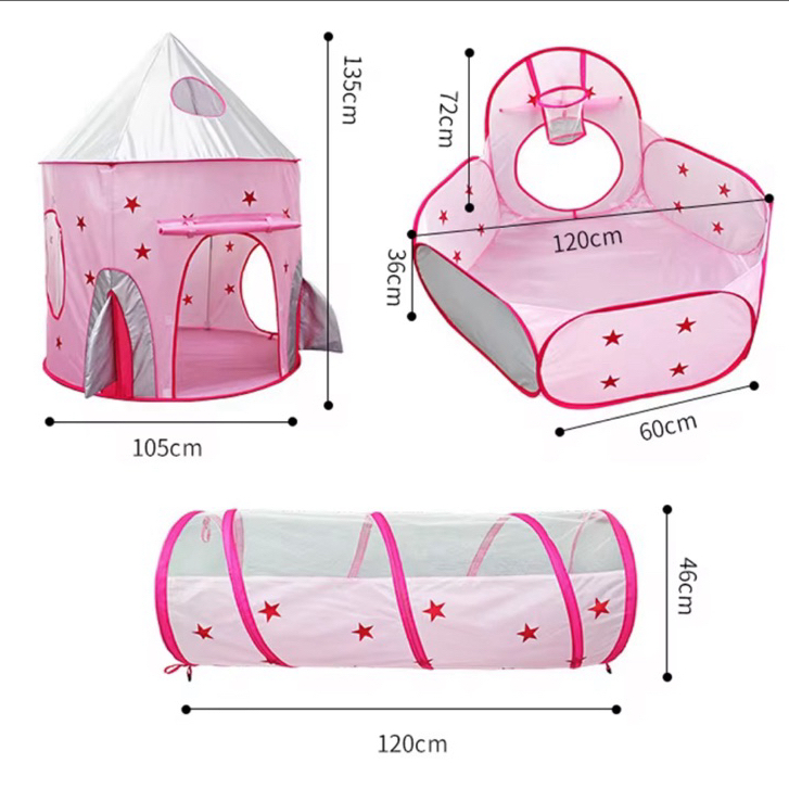 Barraca 3 em 1 Foguete Rosa com Estrelas e Toca Túnel Piscina de Bolinhas com Cesto de Basquete
