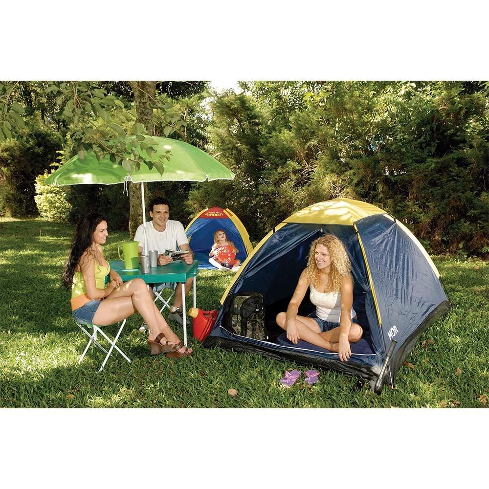 Barraca Iglu 4 Pessoas com Proteção de Vazamentos 9035 - Mor -1421 Barracas fáceis de montar, com peso e volume reduzido devido a sua estrutura em varetas de fibra de vidro interligado-as. São confeccionadas em poliéster, com a costura entre o piso e o dormitório invertida, evitando vazamento de água para o interior da barraca. O piso é confeccionado em polietileno para transporte, porta dupla com tela, mosquiteiro e instruções ilustradas para montagem. Composição do Produto: Tecido da barraca 100% poliéster. Piso 100% polietileno. Varetas 100% fibra de vidro. Mosquiteiro na porta e no teto. Local para pendurar lanterna dentro da barraca. Proteção contra vazamentos 300mm de coluna d'água. Acompanha sacola de transporte. Tamanho e Peso: - Aberta: 2,10mx2,10mx1,30m - Peso: 2,175 Kg