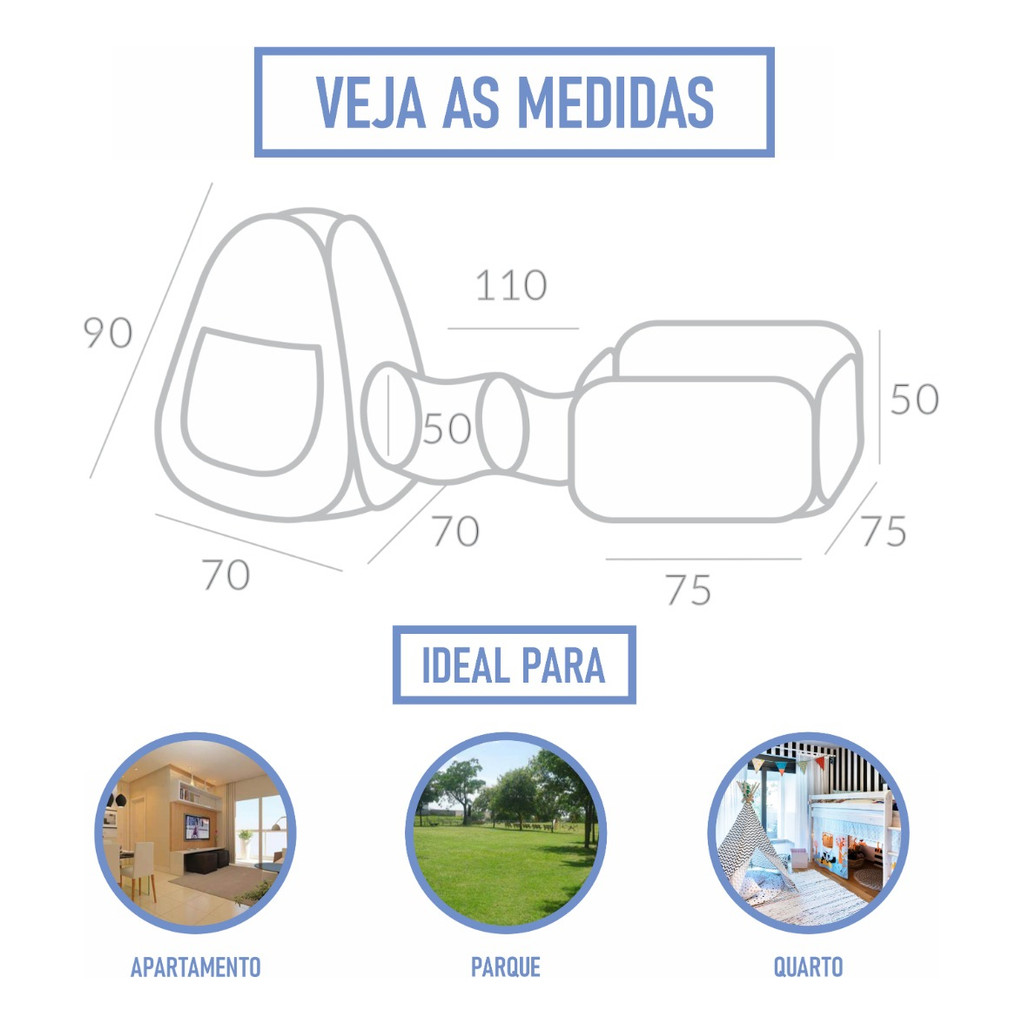 Barraca infantil 3 em 1 Com 40 Bolinhas Barraca infantil 3 em 1 com Piscina de Bolinhas: o melhor presente que você pode dar para o seu filho. Quem é que nunca desejou estar em uma piscina de bolinhas com tunel e cabaninha, mesmo depois de adulto? Sim, este é um espaço que traz diversão, conforto e também, uma sensação de alegria indescritível. Ela possui três ambientes, sendo um túnel, uma toca e uma barraca aberta, além de 40 bolinhas coloridas que ajudam no desenvolvimento da criança. A piscina é um produto muito versátil, principalmente por poder utilizar a barraca, o túnel e a toca juntos ou separados, além de ser fácil de transportar e montar, o que possibilita levar para todos os lugares que você desejar. Realizando sua compra até às 12:00, enviamos o produto NO MESMO DIA, junto com a nora fiscal! Compra segura através do e Mercado Pago. Caso tenha se arrependido da compra, você poderá devolver o produto gratuitamente, e seu dinheiro será devolvido. As crianças precisam de um brinquedo como este! Faça agora mesmo a compra da piscina de bolinhas infantil! Principais Características: - Idade Recomendada: Acima de 3 anos - Fácil de montar - Modelo: Toca Pop Up e Piscina Quadrada Dobrável - Tecido: Poliéster Resistente Especificações Técnicas: - Conteúdo da Embalagem: 1 Toca + 1 Túnel + 1 Piscina + 40 Bolinhas Coloridas - Dimensões aproximadas do produto aberto (LxAxC): Toca: 70 x 90 x 70 cm / Piscina: 75 x 40 x 75 cm / Túnel: 1.15m Aprovado pelo Inmetro. CE-BRI/ICEPEX-N 01224-94 Garanta já a sua! - Para qual idade está piscina? Resposta: A partir de 3 anos de idade. - Essa piscina precisa de bobinha pra encher? Resposta: Sim ela precisa de mais bolinhas para encher até a borda. O nosso modelo já acompanha 40 bolinhas. - Cabe até quantas bolinhas? Resposta: Nossa Piscina comporta até 450 bolinhas. - Qual o tamanho do produto? Resposta: Nas imagens do produto tem uma foto ilustrativa com as medidas seria (LxAxC): Toca: 70 x 90 x 70 cm / Piscina: 75 x 40 x 75 cm / Túnel: 1.15m - Ola bom dia tem como escolher o tema? Resposta: Sim claro, na hora da compra você pode escolher o modelo desejado. - Qual o diâmetro da bolinha? Uma criança de 1 ano consegue por na boca? Resposta: Nossa bolinha possui 80mm de diâmetro uma criança de não consegue engolir - Da para colocar água na piscina? Resposta: Não é possível colocar agua. - Ela vem na caixa ou na bolsa? Resposta: Produto vai em caixa de papelão e não possui bolsa. - Serve como cercadinho também? Resposta: Não, o produto não foi desenvolvido para este fim. - Se eu comprar hoje quando o produto chega? Resposta: O prazo é informado pelo no ato da compra, levando em consideração a sua localização no Brasil. As entregas do sempre são mais rápidas que os correios. - Consigo comprar mais bolinhas no mesmo anuncio? Resposta: Não é possível adicionar mais bolinhas a esta compra o produto já vem pronto de fabrica caso deseje mais bolinhas seria necessário comprar a parte.
