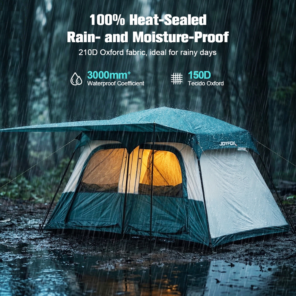 Modelo 2026, tecido aprimorado, impermeabilidade aprimorada 👨👩👧👦 Espaço Versátil para Todos: Com capacidade para até 8 pessoas, esta barraca é perfeita para famílias que buscam conforto sem carregar peso excessivo. Seu design inteligente permite que você aproveite cada centímetro interno, ideal para um descanso merecido após um dia de aventura. 🛡️ Proteção Impermeável e Selada: Segurança em primeiro lugar! Fabricada em Oxford 150D com tratamento PU, nossa barraca conta com costuras totalmente seladas nas áreas críticas, incluindo teto e base. O piso em PE de alta resistência isola a umidade do solo, mantendo o interior seco e aconchegante. ✨ Varanda Privativa Integrada: Diferente das barracas comuns, a JOYFOX inclui hastes extras para criar uma varanda na entrada. É o lugar perfeito para deixar o calçado, cozinhar ou simplesmente apreciar a vista com sombra e ventilação. 🏠 Privacidade com Quarto Separado: A barraca já vem com uma divisória interna fixa, permitindo separar os ambientes. Mais privacidade para os pais ou para organizar melhor suas bagagens como se estivesse em um quarto de hotel itinerante. 🌬️ Circulação de Ar Superior: Equipada com janelas e portas de alto desempenho, garantindo frescor constante e impedindo a entrada de insetos. A montagem é intuitiva com hastes de aço e fibra de vidro reforçadas. Dimensões Externas: 320 x 210 x 180 cm (Espaçosa o suficiente para ficar em pé!) Materiais: Oxford 150D PU 3000mm (Teto e Laterais) / Piso PE 4000mm Estrutura de Elite: 6 Hastes de Aço + 3 Varetas de Fibra de Vidro (Estabilidade contra ventos)