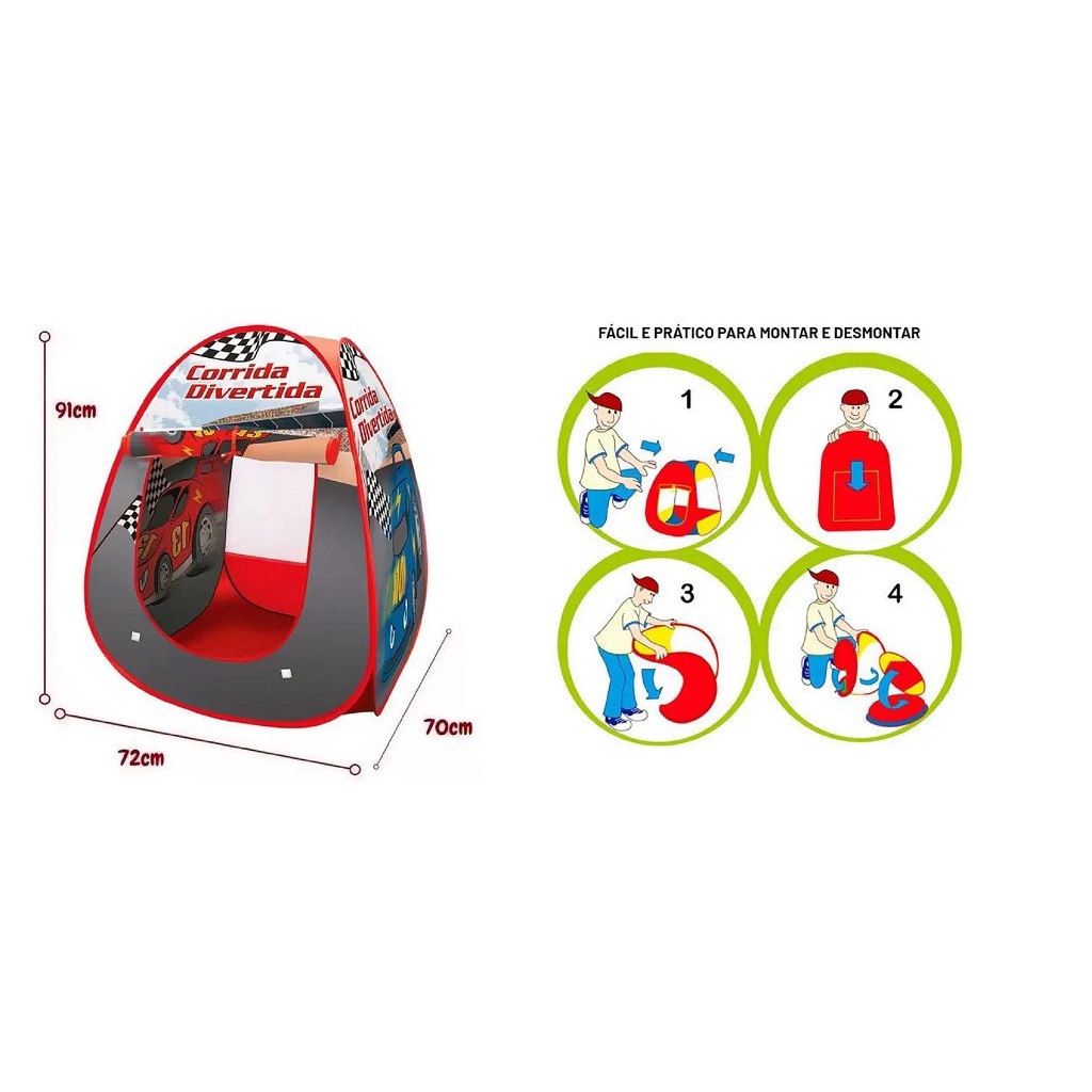 A Barraca Corrida divertida vem numa estampa exclusiva de corrida onde a criança vai adorar brincar de fazer acampamento. São flexíveis e dobradas ficam guardadas sem fazer volume na sacola plástica que a acompanha. Dimensões da Barraca Montada: 72 cm x 70 cm x 91 cm Dimensões da Aproximadas da Embalagem: 6cm X 37cm X 35cm (Altura x Largura x Comprimento/Profundidade)