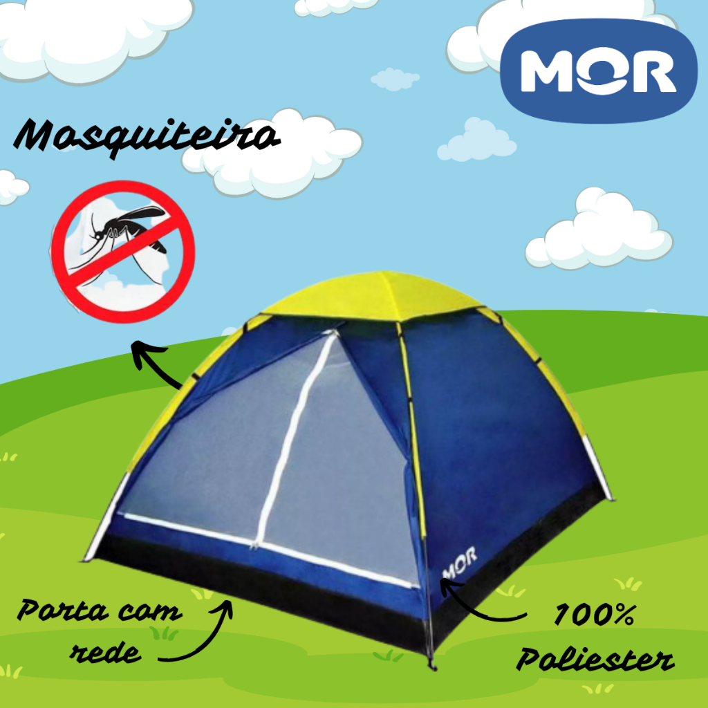 DESCRIÇÃO DO PRODUTO: As Barracas Iglu da Mor são super fáceis de montar devido a sua estrutura em varetas de fibra de vidro interligadas. São confeccionadas em poliéster e a costura entre o piso e o dormitório é invertida, evitando vazamentos de água para o interior da barraca. O piso é confeccionado em polietileno (ráfia) reforçado. Além disso, elas possuem sacola de nylon para transporte, mosquiteiro na porta e no teto, local para pendurar lanterna dentro da barraca e proteção contra vazamentos! Este produto é próprio para 3 pessoas. Acompanha sacola de transporte. CARACTERÍSTICAS DO PRODUTO: Tipo de Material: 100% poliéster. Piso 100% polietileno. Varetas 100% fibra de vidro. Cor: Azul Peso: 1,50Kg Coluna d'agua: 300mm DIMENSÕES DO PRODUTO: Altura: 1,15 m Largura: 1,60 m Comprimento: 2,05 m