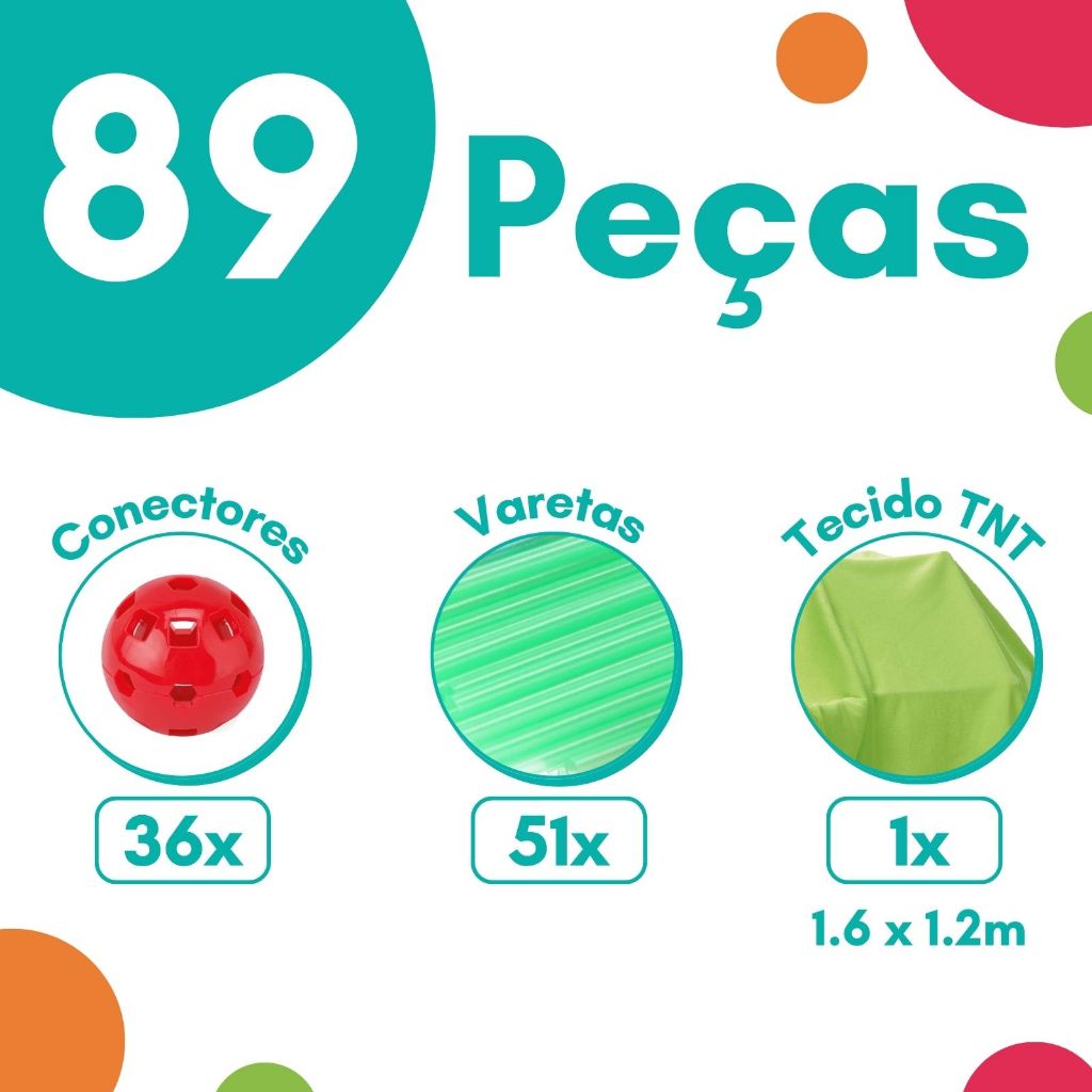 BARRACA INFANTIL TENDA CABANINHA 3D - ATENTU Tenda Infantil, ideal para estimular a criatividade das crianças na montagem de casinhas, castelos, foguetes e muito mais. O brinquedo acompanha um tecido para o teto da cabana e um conjunto de varetas reforçadas que suportam até 3kg, permitindo cobrir a estrutura com diferentes lenços ou panos com facilidade. ESPECIFICAÇÕES: Recomendado para crianças a partir dos 3 anos; Varetas que brilham no escuro; Suporta tecidos de até 3Kg para cobrir a cabana inteira; 87 peças no total; Certificação INMETRO: 007317/2024; Marca: ATENTU. CONTEÚDO DA EMBALAGEM: 51 varetas de montagem (31 cm cada); 36 conectores (3,5 cm); 1 tecido de cobertura (1,5 x 1,9 m); Manual de instruções. IMPORTANTE: Garantia: 3 meses a partir da data de recebimento – para defeitos de fabricação (não cobrimos mau uso). Todos os Direitos Reservados. Em caso de cópia desta descrição e fotos, os responsáveis serão cobrados de acordo com a Lei (9.610/98) de Direitos Autorais.