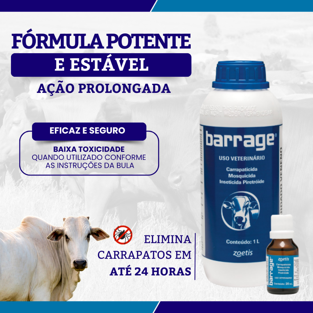 Barrage 20ml Carrapaticida Mosquicida Zoetis Carência Zero No Leite Alto Rendimento