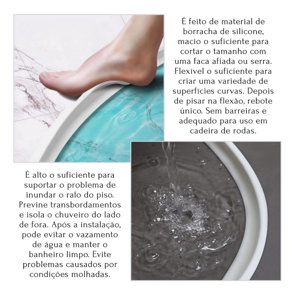 Fita Peitoril De Barreira De Água De Silicone A Fita de Bloqueio de Água em TPE é ideal para áreas molhadas, como banheiros, cozinhas, e lavanderias, proporcionando uma barreira eficaz contra o vazamento de água. Com material resistente e flexível, ela é fácil de instalar e pode ser utilizada em diferentes superfícies. O design compacto permite que seja colocada em diversos ambientes sem interferir na estética. Perfeita para evitar o acúmulo de água fora das áreas desejadas. Passos de instalação: -Remova a água e poeira da superfície que será instalado. -Determine onde instalar a tira impermeável e marque-a no chão com uma caneta. -Remova a fita autoadesiva e prenda a tira de retenção de água no piso na posição marcada. Material: TPE (elastômero termoplástico), Silicone Flexível Comprimento: 2 Metros Largura: 3 cm Altura: 5 cm