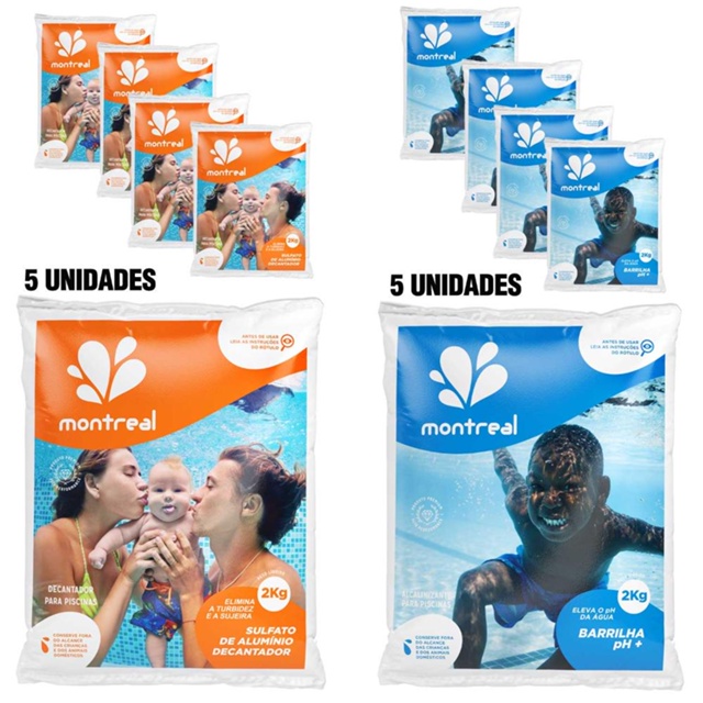 Kit 5 Barrilhas Elevador de PH 2 KG/Cada + Kit 5 Decantadores Sulfato de Alumínio 2 KG/cada MONTREAL COMPOSIÇÃO DO COMBO: 5 Barrilhas para Piscina Elevador de PH 2 KG MONTREAL O valor do pH em piscinas deve ser mantido entre 7,2 e 7,6. Se o pH estiver abaixo da faixa ideal, use a Barrilha para piscina. Barrilha leve em pó Saco plástico de 2kg Para controle do pH Carbonato de sódio Quantidade: 5 Embalagens de 2 Kg/CADA Marca: Montreal 5 Decantador Sulfato de Alumínio 2 Kg MONTREAL No excesso de impurezas ou a alta turbidez na água da piscina, faz-se necessária a DECANTAÇÃO utilizando o Sulfato de Alumínio Montreal, em conjunto com a barrilha. Depositada no fundo da piscina, a impureza é facilmente retirada pela aspiração. Quantidade: 5 Embalagens de 2 Kg/CADA Marca: Montreal * Imagens meramente ilustrativas.
