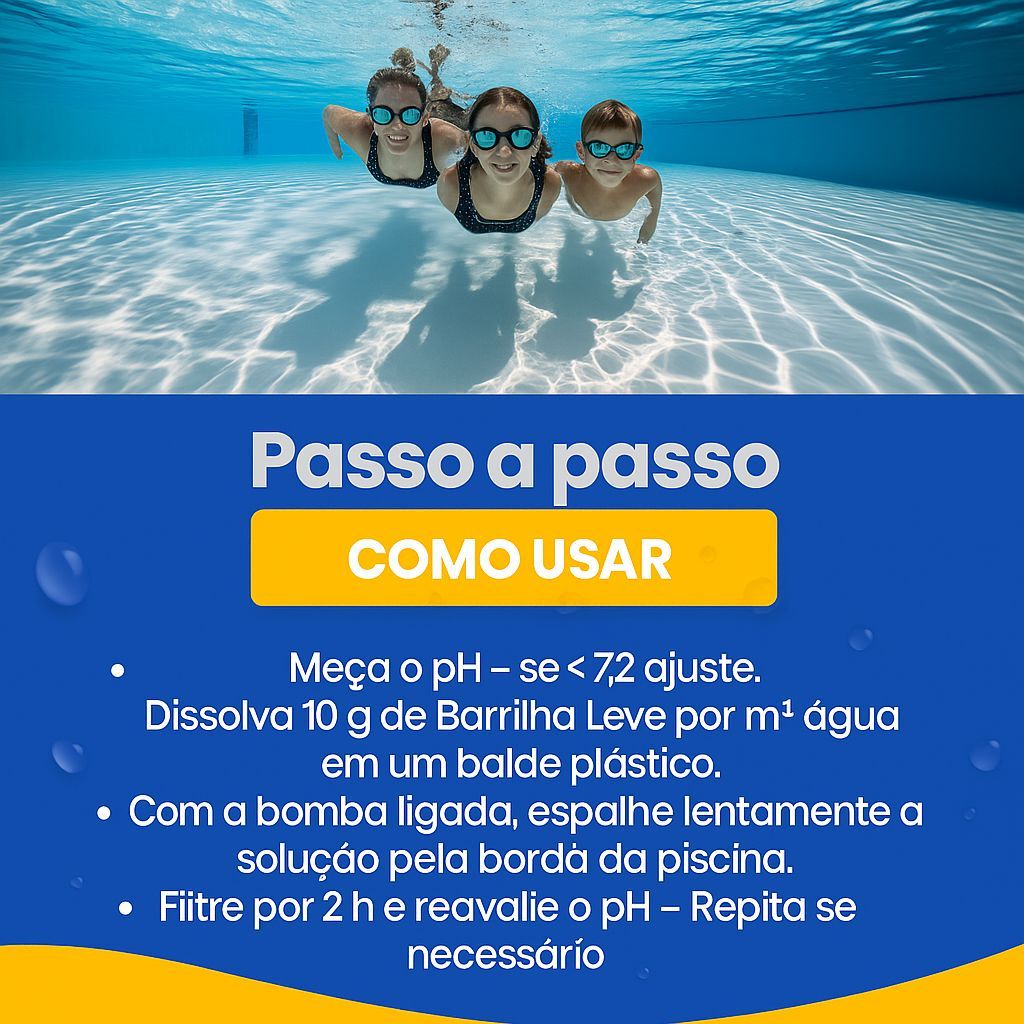 Barrilha Leve – Elevador de pH para Piscinas Mantenha sua piscina sempre limpa, cristalina e segura com a Barrilha Leve, o elevador de pH ideal para uso doméstico! Corrige rapidamente o pH da água, evitando ardência nos olhos, ressecamento da pele e corrosão de equipamentos Fácil de usar – dissolva em água e aplique diretamente na piscina Produto versátil: também pode ser usado para limpeza pesada e pequenas aplicações químicas domésticas Alta pureza e eficiência garantida Especificações: Quantidade: 2kg Composição: Carbonato de Sódio (Barrilha Leve) Embalagem resistente e segura Envio rápido para todo o Brasil! Pague com segurança e facilidade Pronta entrega – compre hoje e receba em casa! Dica de uso: Verifique o pH da água com um kit medidor e aplique a quantidade recomendada conforme o volume da piscina.