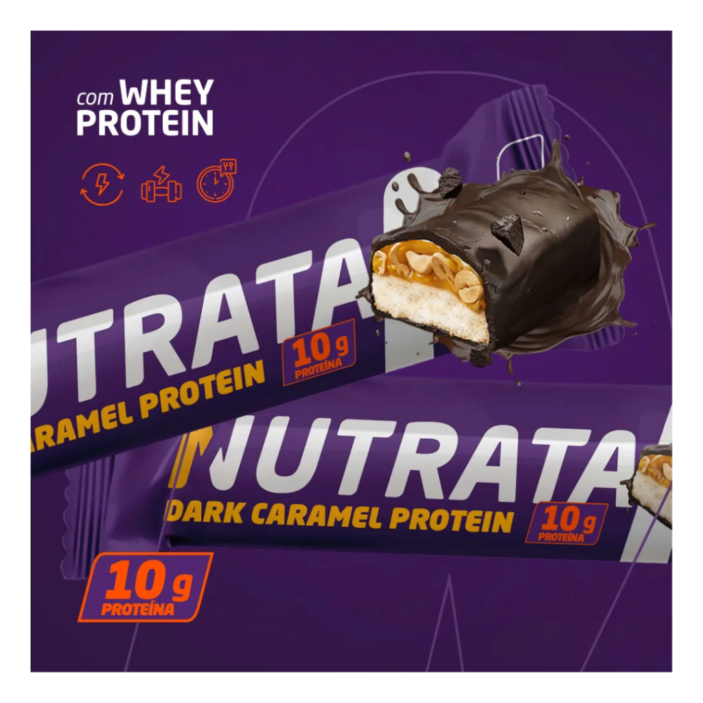 Barra de proteína com recheio macio de caramelo e amendoim crocante, finalizada com uma deliciosa cobertura de chocolate. DESCUBRA O SABOR IRRESISTÍVEL DO CHOCOLATE PROTEICO COM AMENDOIM DA NUTRATA! - 10 g de proteínas; - Deliciosa cobertura de chocolate; - Recheio de caramelo macio e amendoim crocante; - Blend de proteínas de alto valor biológico; - Com whey protein; - 50% menos carboidratos que um chocolate comum; - 78% menos açúcar que um chocolate comum; - 0 gordura trans; - Sem adoçantes artificiais. ----------------------------------------------- ------------------------------------------------------------- ------------------------------------------------- QUANDO CONSUMIR A NUTRATA CARAMEL? Antes do treino; Para saciar a fome entre as refeições; Para aumentar a energia quando bater o cansaço; Como uma sobremesa. ----------------------------------------------- ------------------------------------------------------------- ------------------------------------------------- Sabor Caramel Ingredientes: Ingredientes: Blend proteico (caseinato de cálcio, proteína concentrada de leite, proteína de soro do leite concentrada, proteína de soro do leite isolada e colágeno hidrolisado), recheio de caramelo, amendoim torrado, cobertura sabor chocolate ao leite, óleo de palma (Elaeis guineenses), polidextrose, pasta de amendoim, frutooligossacarídeos (FOS), cloreto de sódio, edulcorantes maltitol e sorbitol, umectante glicerol, antiumectante fosfato tricálcico, emulsificantes goma acácia e lecitina de soja, aromatizantes, conservantes sorbato de potássio e benzoato de sódio e antioxidante DI-alfa-tocoferol. CONTÉM LACTOSE. ALÉRGICOS: CONTÉM AMENDOIM E DERIVADOS DE LEITE E DE SOJA. PODE CONTER AVELÃ. NÃO CONTÉM GLÚTEN. Sabor Dark Caramel Ingredientes: Ingredientes: Blend proteico (caseinato de cálcio, proteína concentrada de leite, proteína de soro do leite concentrada, proteína de soro do leite isolada e colageno hidrolisado), recheio de caramelo, amendoim torrado, cobertura sabor chocolate meio amargo, óleo de palma (Elaeis guineenses), polidextrose, pasta de amendoim, frutooligossacarideos (FOS), cloreto de sódio, edulcorantes maltitol e sorbitol, umectante glicerol, antiumectante fosfato tricalcico, emulsificantes goma acácia e lecitina de soja, aromatizantes, conservantes sorbato de potássio e benzoato de sódio e antioxidante DI-alfa-tocoferol. CONTÉM LACTOSE. ALÉRGICOS: CONTÉM AMENDOIM E DERIVADOS DE LEITE E DE SOJA. PODE CONTER AVELÃ. NÃO CONTÉM GLÚTEN.