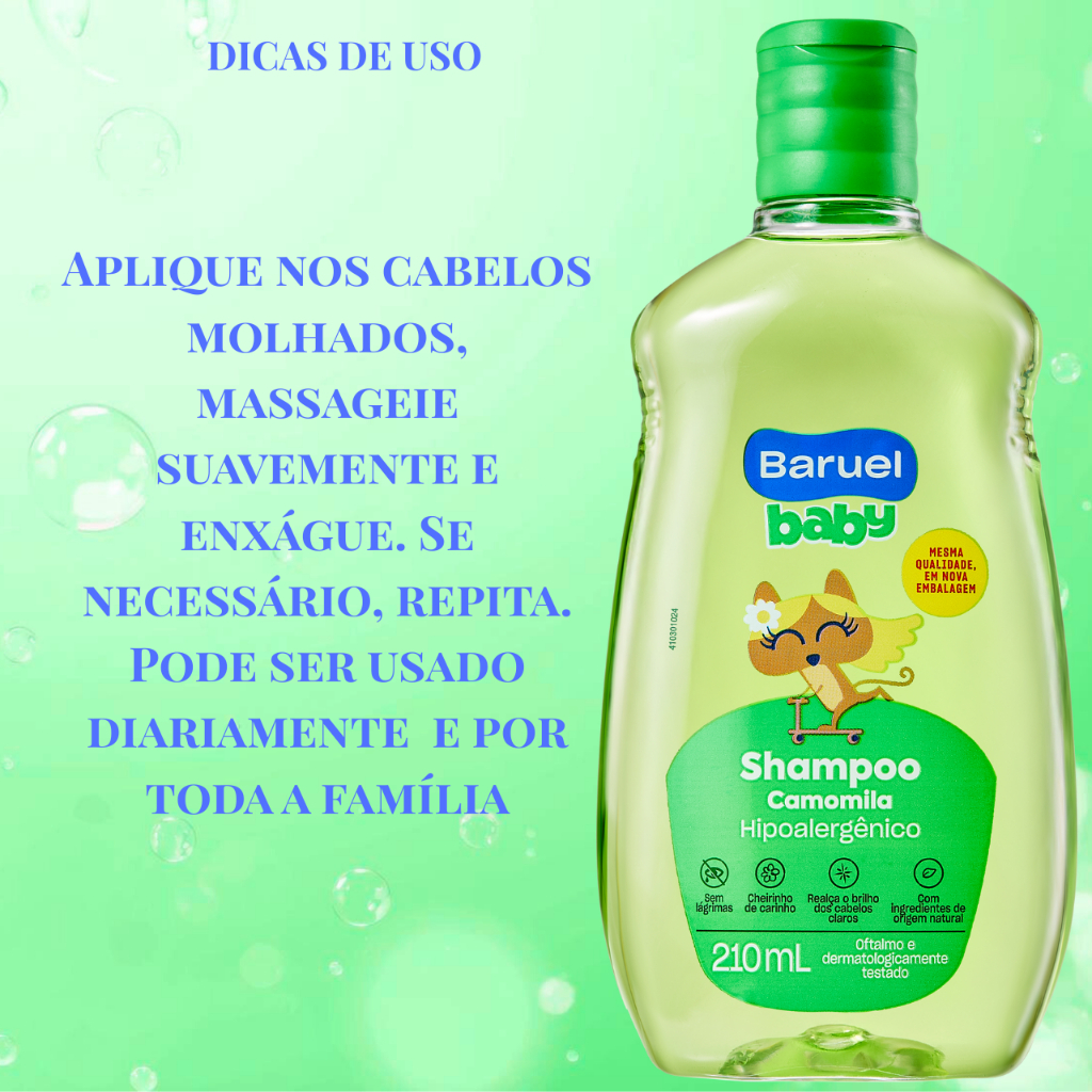 O Shampoo Baruel Camomila cuida dos cabelos com carinho enquanto limpa suavemente . Com camomila, ajuda a realçar os tons claros, deixa os fios macios, brilhantes e com aquele cheirinho delicado que dá sensação de frescor e bem-estar. Ideal para uso diário e perfeito para toda a família