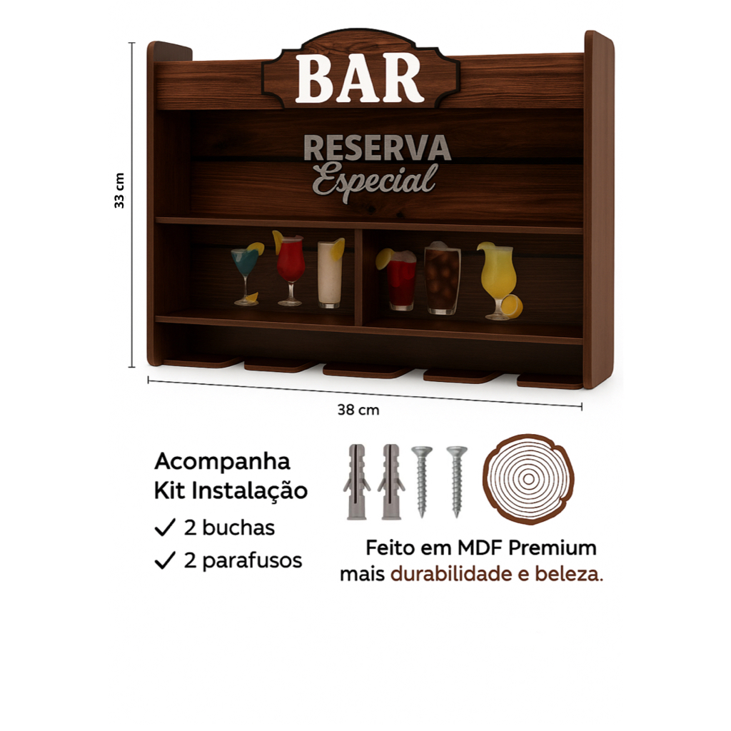 🍷 Barzinho Suspenso com Adega – Charme e Praticidade para sua Área Gourmet! Se você ama reunir amigos, curtir um bom vinho ou simplesmente deixar seu cantinho mais bonito e organizado, esse barzinho foi feito pra você! 💛 Compacto, estiloso e super funcional, ele é ideal para decorar e organizar sua área gourmet, varanda ou espaço de churrasco com muito bom gosto! 💡 Destaques do Produto: Espaço para 4 garrafas de vinho ou bebidas favoritas Suporte inferior para até 4 taças penduradas Estrutura em MDF resistente Acabamento bonito e fácil de limpar Vai bem com qualquer estilo de decoração: do rústico ao moderno 📐 Medidas Aproximadas: Altura: 33 cm Largura: 38 cm Profundidade: 12 cm 🛠️ Instalação sem mistério: Acompanha parafusos e buchas, prontinho pra você fixar na parede com facilidade (e deixar seu cantinho ainda mais incrível)! Perfeito pra quem ama funcionalidade com estilo e quer deixar o ambiente pronto pra bons momentos – seja um churrasco com a família ou aquele vinho no fim do dia 🍷✨ 💬 Agradecemos por escolher a Elias Utilidades. É uma alegria fazer parte do seu lar, oferecendo praticidade, beleza e qualidade. Em caso de dúvidas, nossa equipe está à disposição para te atender com atenção e cuidado.