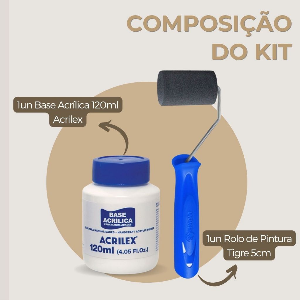 Base Acrílica para Artesanato Branca 120ml Acrilex + Rolo Pintura Tigre Kit para Pintura Madeira MDF