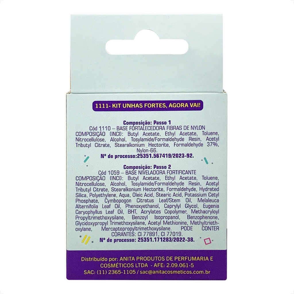 Kit Unhas fortes Anita Agora vai! Base fortalecedora de unhas com fibras de nylon Unhas mais fortes, hidratadas e protegidas. Evita quebras e descamação. Kit contém: 1 Base fortalecedora fibras de nylon passo 1 1 base niveladora fortificante passo 2 Modo de uso Aplique a base passo 1 e em seguida o passo 2. É imprescindível o uso do passo 2 para um resultado das unhas fortes.