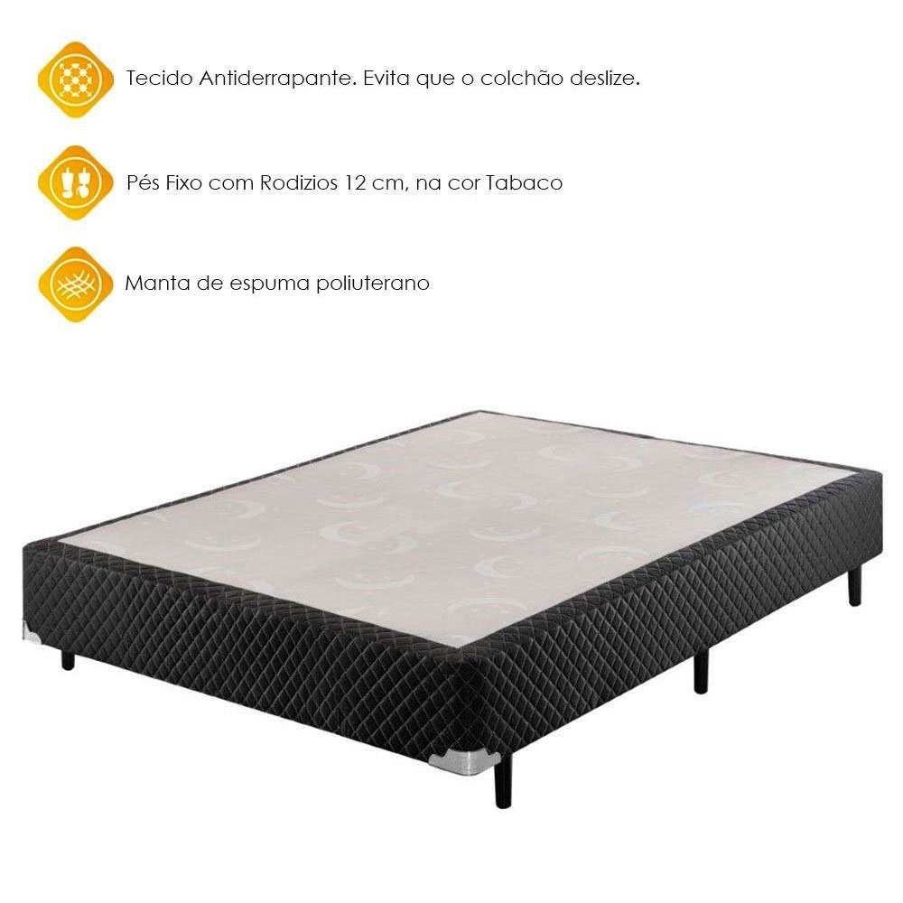 Cama sommier da ecoflex, perfeito para seu colchão. Estruturado em madeira com estrado reforçado, revestimento em chapa de compensado 4mm com manta de espuma poliuretano, conforto, resistência e durabilidade. Canto arredondado, lateral do sommier com tecido 100 poliéster bordado. O tratamento antiácaro, antifungo e antialérgico, previnem contra a alta concentração de alérgenos melhorando a higiene. Proteção duradoura contra ácaros, poeira doméstica, mofo, bactérias e alérgenos correspondentes. Características Pés fixo com rodízios 12 cm. Revestimento com tecido liso Faixa lateral bordada Estrutura em madeira Manta de espuma poliuretano Revestimento em chapa de compensado 4mm Estrado em madeira Tampo com tecido antiderrapante Peso suportado até 120 kg Para colchão padrão casal: 138 x 188 cm.(não incluso) Dimensões Altura: 25 cm Largura: 138 cm Comprimento: 188 cm Altura com Pés: 37 cm Garantia do Fornecedor de 12 meses