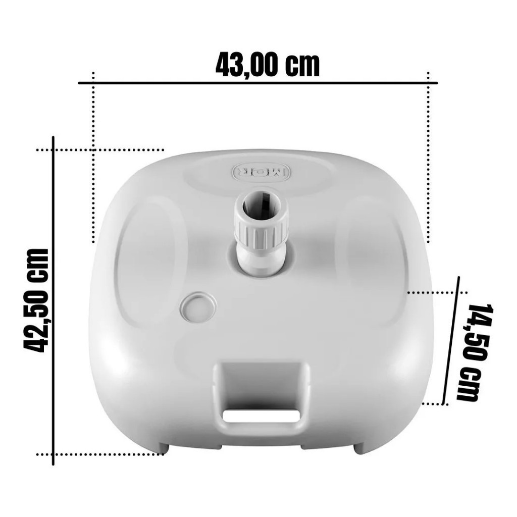 Descrição A base para guarda-sol ou ombrelone MOR é resistente, mantendo seu Guarda-Sol ou Ombrelone estável no solo, sem risco de se deslocar com ventos fortes. Produzida em polietileno, pode ser preenchida com 18l de água ou 22kg de areia para fixar seu guarda-sol em qualquer lugar. A base tem compatibilidade com hastes de ø19mm a ø36mm. Perfeita para trazer mais praticidade para os seus momentos de lazer! Especificações Altura com a haste: 0,242m Capacidade: 18L de água ou 22kg de areia Altura: 14,50 Centímetros Largura: 43,00 Centímetros Comprimento: 42,50 Centímetros Peso: 1,06 Kilogramas Outras características Largura x Comprimento: 43 cm x 42 cm Altura total: 14.5 cm Disponivel nas cores Branco e Preto.