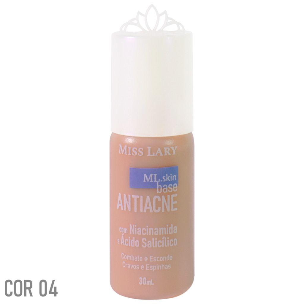 Além de maquiar a pele, a Base Antiacne da Miss Lary possui uma combinação exclusiva de Ácido Salicílico e Niacinamida para combater os cravos e espinhas, melhorar a aparência dos poros e linhas finas, e uniformizar o tom da pele. A Base Antiacne neutraliza e absorve a oleosidade da pele, tem textura extremamente sedosa e toque seco, promovendo efeito matte com aspecto aveludado. Modo de Uso: Aplique sobre o rosto e com o auxílio de uma esponja ou pincel, espalhe o produto até obter o acabamento desejado. ATENÇÃO: O conteudo total (em ml) da base foi atualizado recentemente, passando de 30 a 20ml