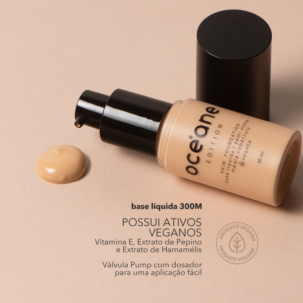 Deseja Conquistar Um Visual Deslumbrante com Uma Pele Incrivelmente Uniforme, Exatamente Como Sempre Sonhou? Pois Saiba Que Essa Base Está Ao Seu Alcance e Promete Ser Sua Aliada Fiel. a Linha Océane Edition Apresenta a Skin Foundation, Uma Base Líquida Que Proporciona Uma Maquiagem de Aspecto Profissional Todos Os Dias. Esta Base É Essencial em Seu Nécessaire, Pois É Um Produto de Qualidade Que Fará Toda a Diferença em Sua Rotina de Beleza. Estamos Falando de Uma Base Semi-Matte com Cobertura Média e Um Acabamento Suave. Ela Uniformiza o Tom da Pele de Maneira Impecável, sem Sobrecarregar. Além Disso, Não Realça As Linhas de Expressão e Corrige Pequenas Imperfeições Faciais. e para Sua Tranquilidade, Ela Tem Longa Duração. A Cor 300m É Uma Base de Tom Médio Que Transita Por Diferentes Tonalidades de Pele. ou Seja, Ela É Muito Versátil e Foi Inspirada Nas Cores da Pele Das Brasileiras. Ela Tem Uma Textura Super Confortável Que Não Incomoda. Além Disso, Você Pode Finalizar Essa Base Usando Um Pó, Seja Solto ou Compacto. e Não Se Preocupe, Porque Sua Make Não Fica com Aspecto Pesado. Confie Na Skin Foundation em Todos Os Momentos do Seu Dia, Seja para a Maquiagem do Trabalho, Um Happy Hour ou Um Jantar Romântico. Isso Porque Esta Base Líquida Permite a Criação de Camadas, Proporcionando Um Acabamento Mais Natural ou Mais Sofisticado. Independentemente da Ocasião, Você Pode Criar Produções Incríveis. Além de Todos Esses Benefícios, Esta Base Líquida Possui Uma Fórmula Vegana, o Que Significa Que Não Contém Ingredientes de Origem Animal em Sua Composição. Ela É Enriquecida com Vitamina E, Hamamélis e Extrato de Pepino e É Apresentada em Uma Embalagem com Válvula Pump Que Evita o Desperdício e Torna a Aplicação Extremamente Prática. Agora É o Momento Perfeito para Incluir a Skin Foundation em Seu Nécessaire e Permitir Que Ela Se Torne Parte Essencial de Sua Vida, Proporcionando Um Cuidado Especial à Sua Pele. A Skin Foundation É Ideal para Peles Maduras? Sem Dúvida! a Skin Foundation Atende às Exigências Específicas da Pele Madura. Ela Não Destaca As Linhas de Expressão e Proporciona Uma Tonalidade Uniforme Ao Rosto. Além Disso, Ela Previne o Temido Efeito Craquelado, Proporcionando Um Acabamento Natural e Suave. Experimente e Aprove.