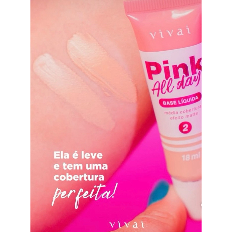 Base líquida matte com cobertura média A base líquida pink all day, da Vivai proporciona uma cobertura leve a média, deixando a pele uniforme. Ela é leve e não deixa aquela sensação grossa na pele, mas tem uma ótima cobertura. O valor acessível, torna a base um produto super indicado para o dia a dia, pelo custo benefício e também por ser de ótima qualidade. enviamos em até 24h