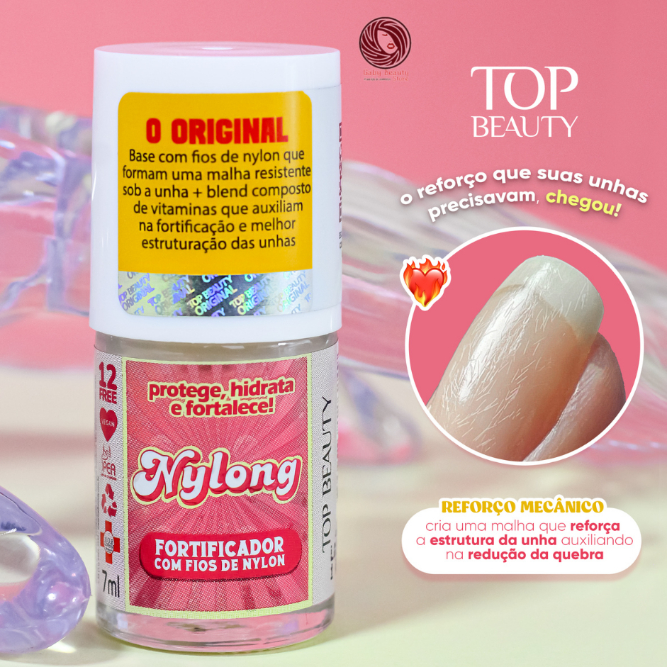 Conheça o NYLONG, a nova base 12FREE com fios de nylon da linha S.O.S UNHAS! Ela forma uma malha resistente que auxilia na fortificação e melhor estruturação das unhas, além de contar com um blend composto de vitaminas que auxilia no crescimento! Bora ter unhão? Free mesmo? SIM! A fórmula é isenta dos 12 principais componentes que são potenciais alergênicos. * PRODUTO ORIGINAL TOP BEAUTY * PRODUTO VEGANO 12 FREE * FRASCO CONTÉM 7ML