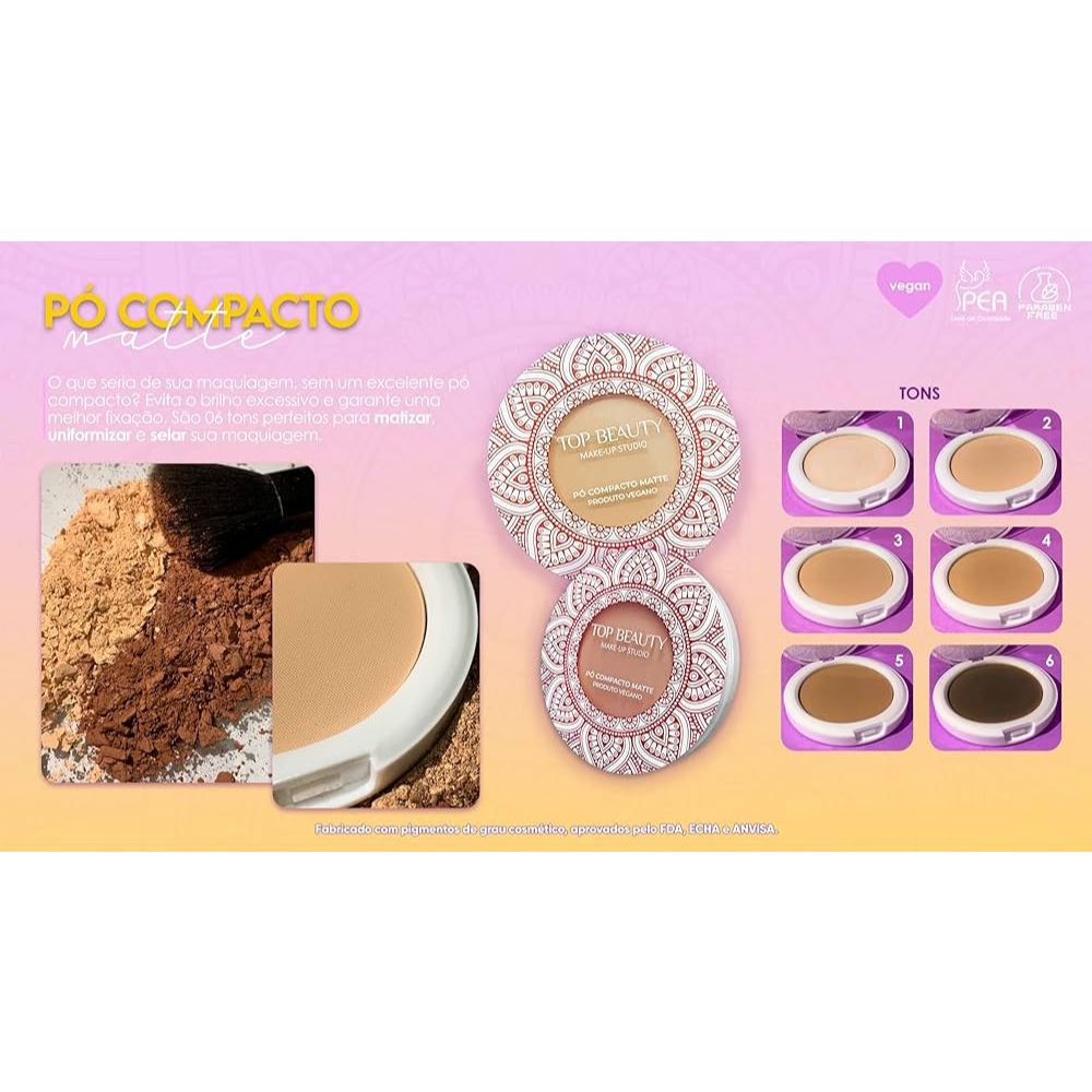 BASE TOP BEAUTY Indispensável para uma perfeita maquiagem, A BASE Top Beauty possui textura suave e possui alta cobertura. É vegana, oil free e contém Vitamina B5 e Vitamina E! Disfarça as imperfeições deixando sua pele perfeita. Ela possuí acabamento matte, toque seco, cobertura alta e se adapta super bem com todos os tipos de pele. São 6 cores diferentes, para atender á todos os tons de pele. DISPONIVEL TAMBEM O PO E CORRETIVO DA MESMA MARCA.