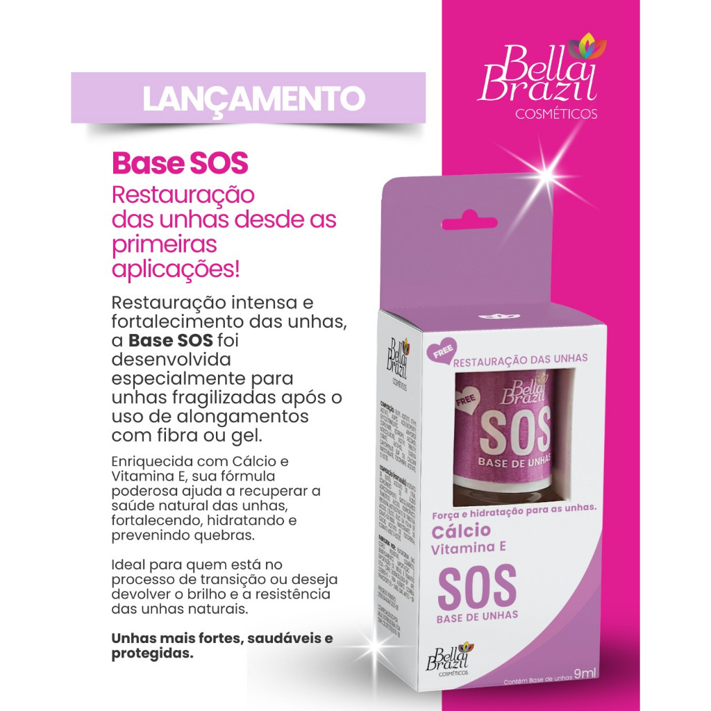 Restauração das unhas desde as primeiras aplicações! Restauração intensa e fortalecimento das unhas, a Base SOS foi desenvolvida especialmente para unhas fragilizadas após o uso de alongamentos com fibra ou gel. Enriquecida com Cálcio e Vitamina E, sua fórmula poderosa ajuda a recuperar a saúde natural das unhas, fortalecendo, hidratando e prevenindo quebras. Ideal para quem está no processo de transição ou deseja devolver o brilho e a resistência das unhas naturais. Unhas mais fortes, saudáveis e protegidas.