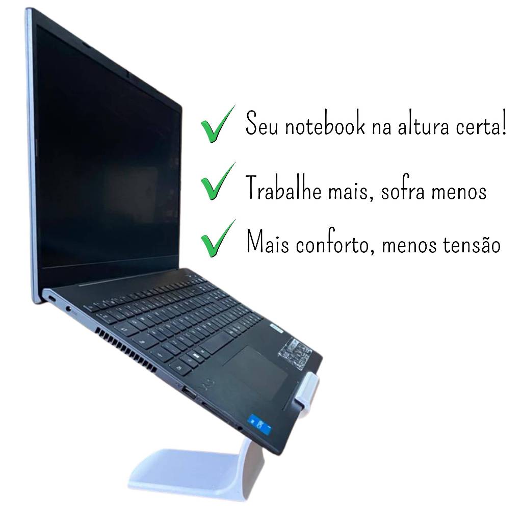 Mais conforto, mais produtividade, mais cuidado com você O suporte para notebook foi desenvolvido para quem passa horas trabalhando e entende que ergonomia não é luxo, é necessidade. Ao elevar o notebook à altura correta dos olhos, ele ajuda a manter a postura adequada, reduzindo a sobrecarga no pescoço, ombros e coluna. O resultado é menos dores, menos fadiga e mais rendimento ao longo do dia. Além do benefício ergonômico, o suporte oferece estabilidade e segurança. Sua base firme mantém o notebook bem apoiado, evitando deslizes e vibrações durante o uso. O design inclinado melhora a circulação de ar, contribuindo para a refrigeração do equipamento e ajudando a preservar o desempenho e a vida útil do notebook. Produzido com foco em qualidade e durabilidade, o suporte une resistência estrutural a um acabamento limpo e moderno, combinando facilmente com ambientes profissionais ou home office. É uma solução prática, funcional e elegante para quem valoriza conforto, organização e eficiência no trabalho. Trabalhe melhor. Trabalhe com mais conforto. Seu corpo agradece