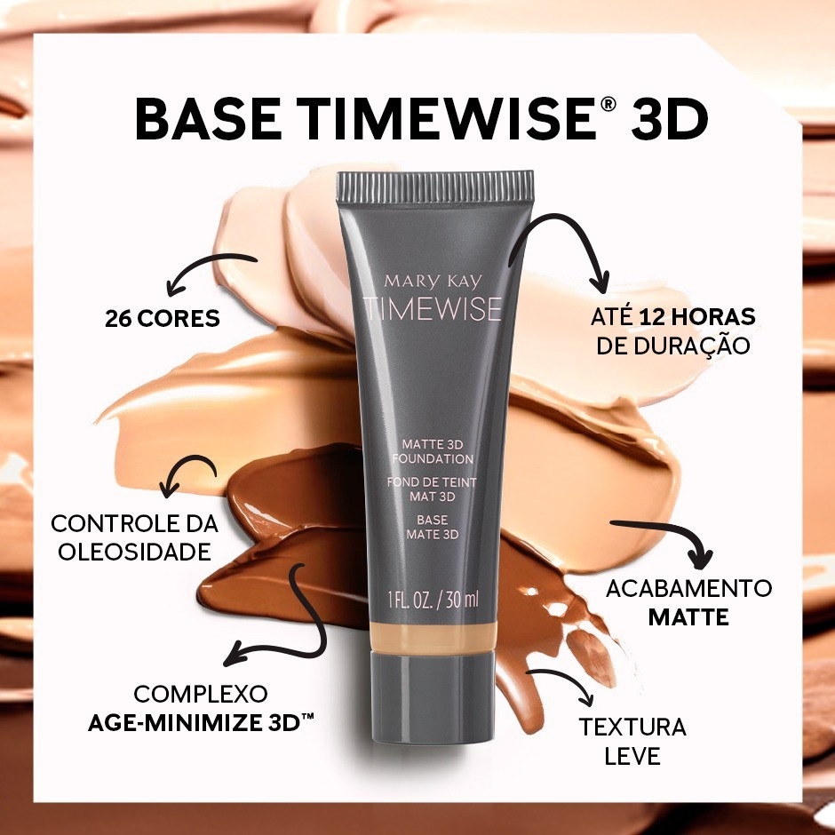 Confia na marca n°1 em base no Brasil*! A Base Timewise 3D® vai além da maquiagem, ela tem propriedades de um dermocosmético e cuida da sua pele! Os principais benefícios da Base Líquida Timewise 3D® Acabamento Matte confortável que não resseca a pele! Formulada com o complexo Age Minimize 3D™ composto por Niacinamida/Nicotinamida, Resveratrol Encapsulado e Peptídeo Especial que juntos têm ação antioxidante e auxiliam na uniformização do tom para uma pele com a aparência renovada e radiante. Longa duração - 12 horas de duração e controle da oleosidade. Ultra Resistente - Não transfere, resistente ao suor e umidade. Esta base líquida foi desenvolvida para a pele brasileira, são 28 tons que contaram com a Tecnologia IntelliMatch™ para captar a diversidade com precisão! *Share Valor, Maquiagem - 100% Base Facial / Total Brasil / Ano Móvel Julho 2023 – Junho 2024 / Nielsen Homescan Encontre seu tom no quiz da base aqui. Amou e quer saber mais? Veja abaixo a lista completa de benefícios desta base! Acabamento matte Formulada com o complexo Age Minimize 3D™ Niacinamida/Nicotinamida (Vitamina B3) – Alta capacidade antioxidante e auxilia na uniformização do tom. Resveratrol Encapsulado – Triplo efeito antioxidante e trabalha em harmonia com o colágeno* natural da pele. Peptídeo Especial - Trabalha em harmonia com colágeno e a elastina* natural da pele para uma aparência renovada e radiante. (*Com base em testes in vitro dos principais ingredientes) Longa duração. São 12 horas de duração e controle da oleosidade! Não transfere, fórmula resistente ao suor e umidade Contém microesferas especiais que agem como esponja absorvendo a oleosidade Não deixa sensação de ressecamento na pele e não marca as linhas de expressão Cobertura média a alta com possibilidade de construção de camadas Fica confortável na pele e deixa um acabamento perfeito Sem fragrância e sem óleo na composição Não comedogênica Dermatologicamente testada, apropriada para peles sensíveis