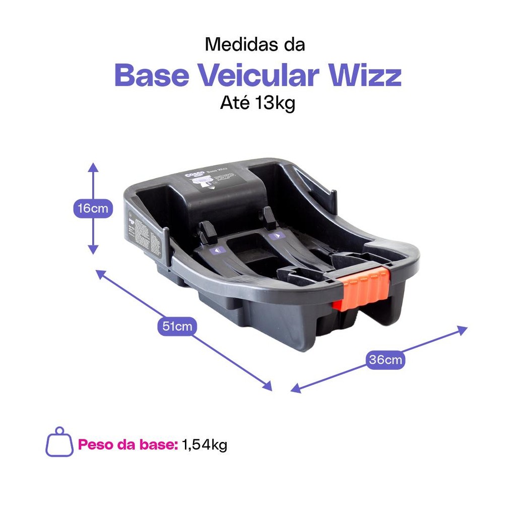 Base compatível para uso com o bebê conforto Wizz. Facinha de instalar, deixa o dia a dia com o bebê conforto Wizz ainda mais prático. O dia a dia das famílias com filhos pequenos fica mais fácil com o uso da base Wizz. Feita para encaixar perfeitamente o bebê conforto Wizz, ela jáfica instalada no carro e só é preciso colocar o bebê conforto nela. Encaixe perfeito com o bebê conforto Wizz -Mais fácil pra colocar e tirar do carro seu pequeno no bebê conforto -Facinho de instalar: passagem onde vai o cinto é fácil de ver e usar -Material leve, mas resistente Especificações: Cor: Preto Material: HDPE, ABS Isofix: Não Instalação: Com cinto de 3 pontos. Medidas (A x L x P | cm): 51 x 36 x 16 Peso: 1,54kg Garantia: 6 meses (Garantia Padrão) + 6 meses (Garantia Estendida*) Conteúdo da embalagem: 1 base, 1 manual *Todos os produtos possuem nota fiscal eletrônica* *Cadastre seu produto no site do fabricante e ganhe 6 meses de garantia estendida* *Aprovada pela Inmetro*