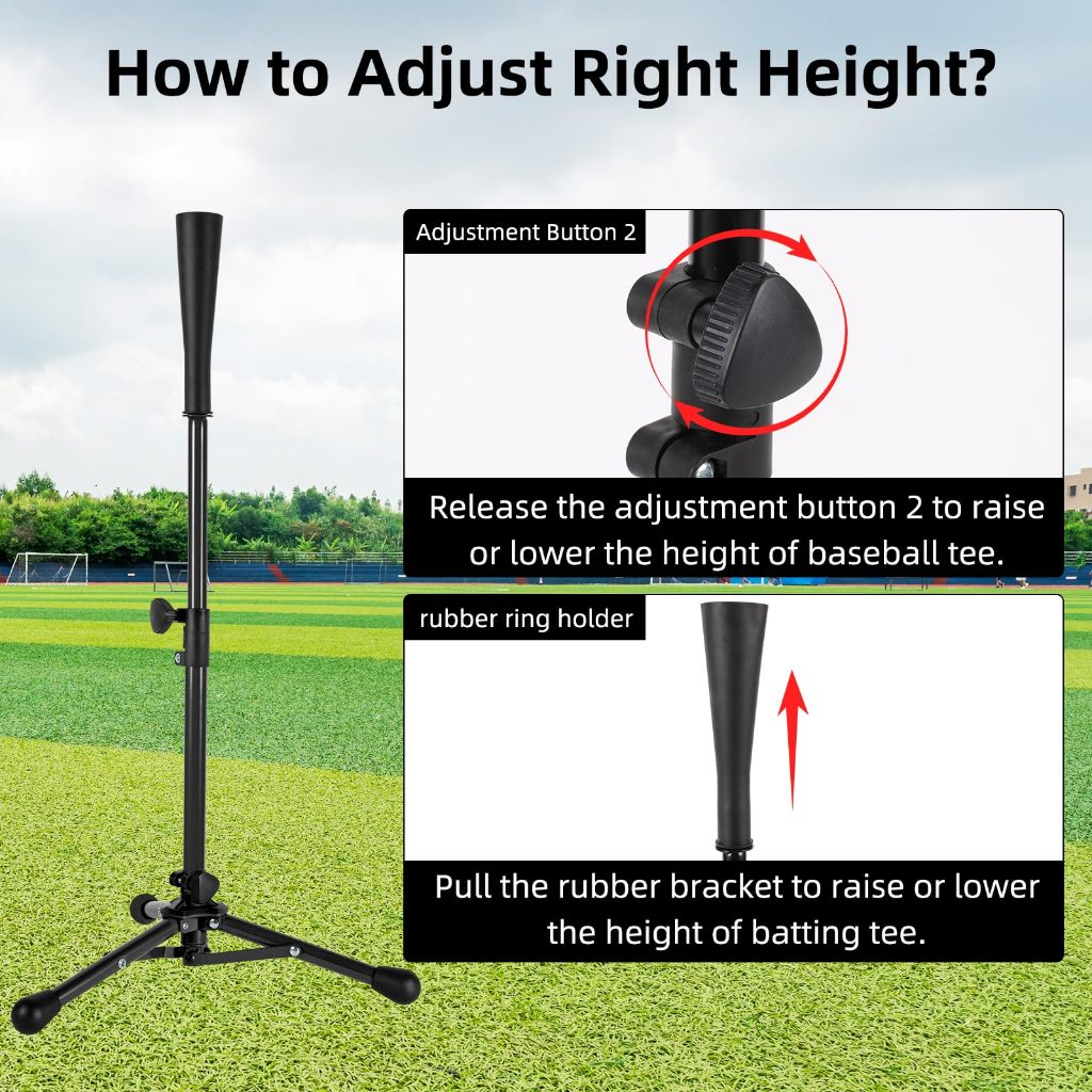 Material:Aço, borracha Forma do produto:Rolo Contagem de folhas:30 Cor:Preto Número de itens:1 Dimensões do pacote do produto:43.7 x 9.7 x 9.2 CM Peso da embalagem:1,31 Quilogramas Dimensões de item:43.2 x 10.2 x 8.9 centímetros Usuários sugeridos Unise x Criança Componentes incluídos Bolsa de transporte, Camiseta de rebatedor de beisebol 【Suporte de tripé Durabel resistente】A camiseta de beisebol possui aço pesado que dá estabilidade extra ao rebatido, tripé resistente para garantir que a camiseta de beisebol não se mova ou caia quando você acertar, com pernas de borracha que fornecem aderência em qualquer superfície interna ou externa, serve ao seu treinamento de rebatidas de longa duração. 【Altura ajustável】As camisetas de beisebol para bater garantem que a altura possa variar de 68 FDLS 117 cm, acomodando bem qualquer zona de ataque e adequada para acomodar jogadores de todas as alturas. A camiseta de beisebol da FDLS é o melhor auxílio de treinamento para você ou seus filhos praticarem. 【Top de borracha ultraflexível】Cada camiseta de softbol é enrolada à mão, durável e macia, que nunca danificará tacos de beisebol em golpes errados, adequada para tipos de bolas, como beisebol, softbol, bola de treinamento, você terá uma sensação real de acerto ao balançar o taco para acertar a bola no top de camiseta com design especial. 【Fácil de montar】 Camiseta de beisebol para crianças sem necessidade de montagem, basta colocá-la em alguns segundos e ajustar a altura e o tamanho de acordo com suas necessidades, sem nenhuma ferramenta, perfeita para jogadores de iniciantes a profissionais. 【Bolsa de transporte de portabilidade】Depois de desmontada, a camiseta de rebatedor ajustável cabe facilmente em uma bolsa de transporte, o que é conveniente para você levar para praticar bater em qualquer lugar que quiser, melhor para você melhorar sua habilidade de beisebol, adequada para ambientes internos e externos.