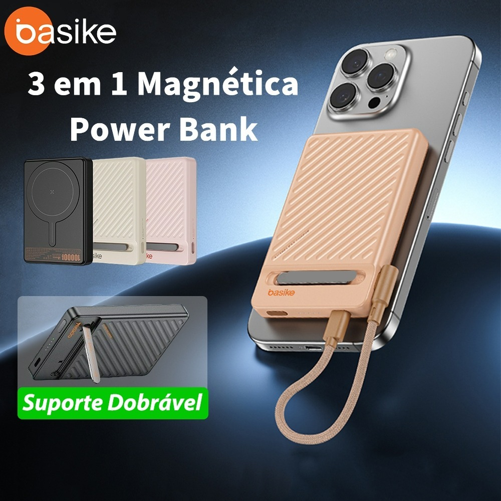 Basike Carregador Portátil Rápido Power Bank 10000mAh 22.5W com Suporte MagSafe 15W Sem Fio Tipo-C para iPhone Android